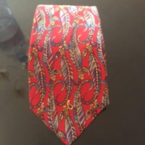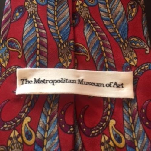 This vintage METROPOLITAN MUSEUM OF ART 100% silk tie is in excellent condition with no signs of damage of any kind. Tie is a deep red with a peacock feather design with notes of blue and plum and yellow. 100% silk. Made in Canada.
