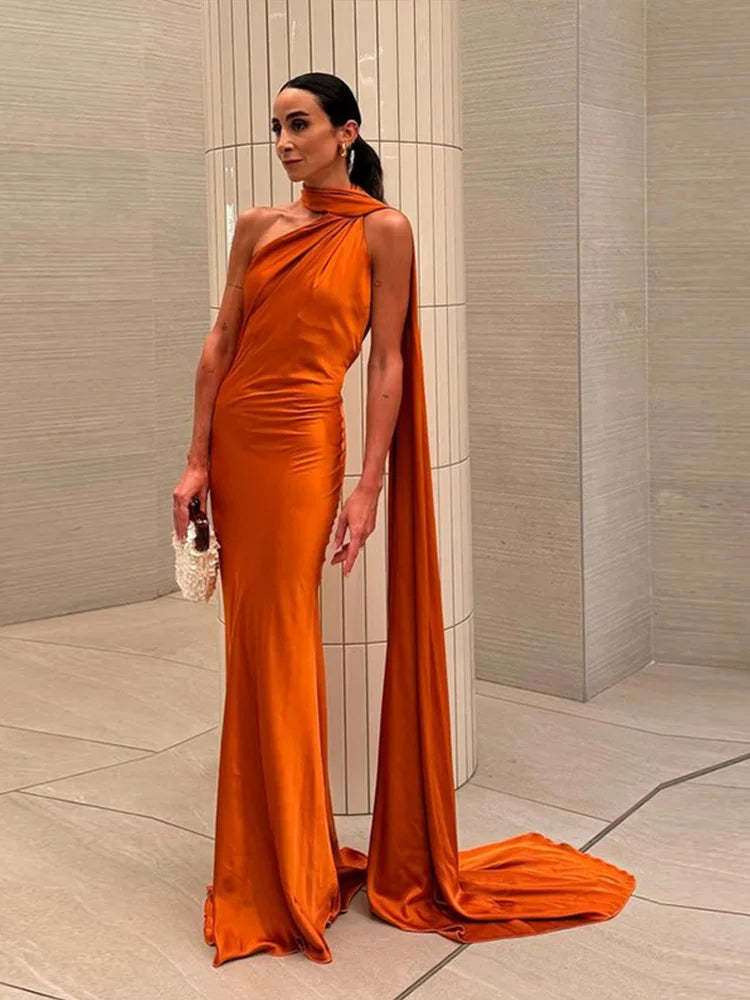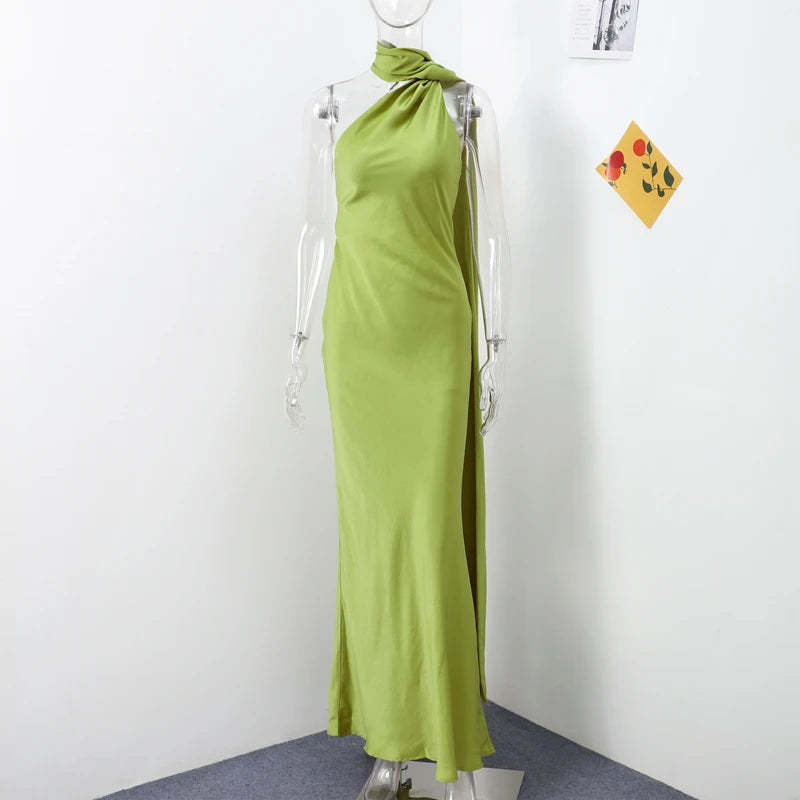 This dress is made from a blend of high-quality polyester, providing a slight stretch for ultimate comfort and a slim fit silhouette. The elegant design features a diagonal collar and a sensual backless detail, perfect for summer nights out. With its long, ankle-length hemline and natural waistline, it exudes luxury and sophistication. This piece is carefully crafted with fine synthetic fibers, making it a must-have addition to any stylish woman's wardrobe.