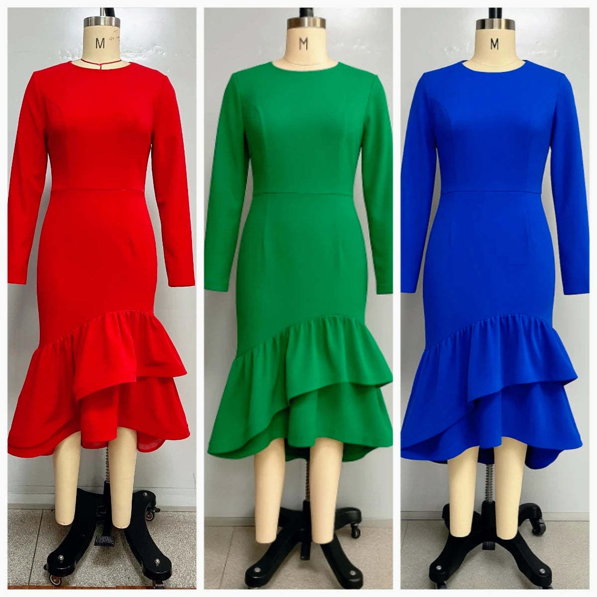 This long-sleeve mermaid dress features high elasticity and a slim, trumpet silhouette that gracefully flatters your figure. Crafted from a comfortable knit blend of polyester and spandex, it offers a smooth fit with an O-neck and tiered ruffle detailing at mid-calf length. Designed for all seasons, its pull-over style ensures ease of wear, while the solid colors in green, red, and blue bring refined elegance to an autumn wardrobe. Ideal for sophisticated occasions or club settings, this dress combines style and comfort effortlessly.