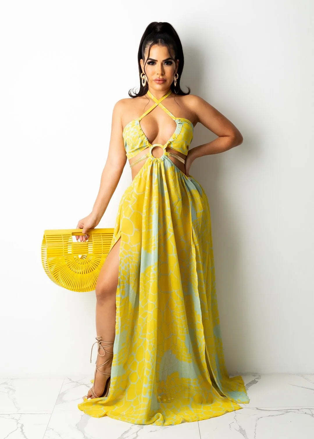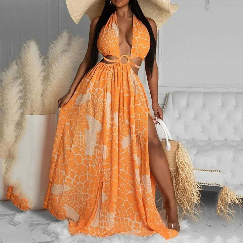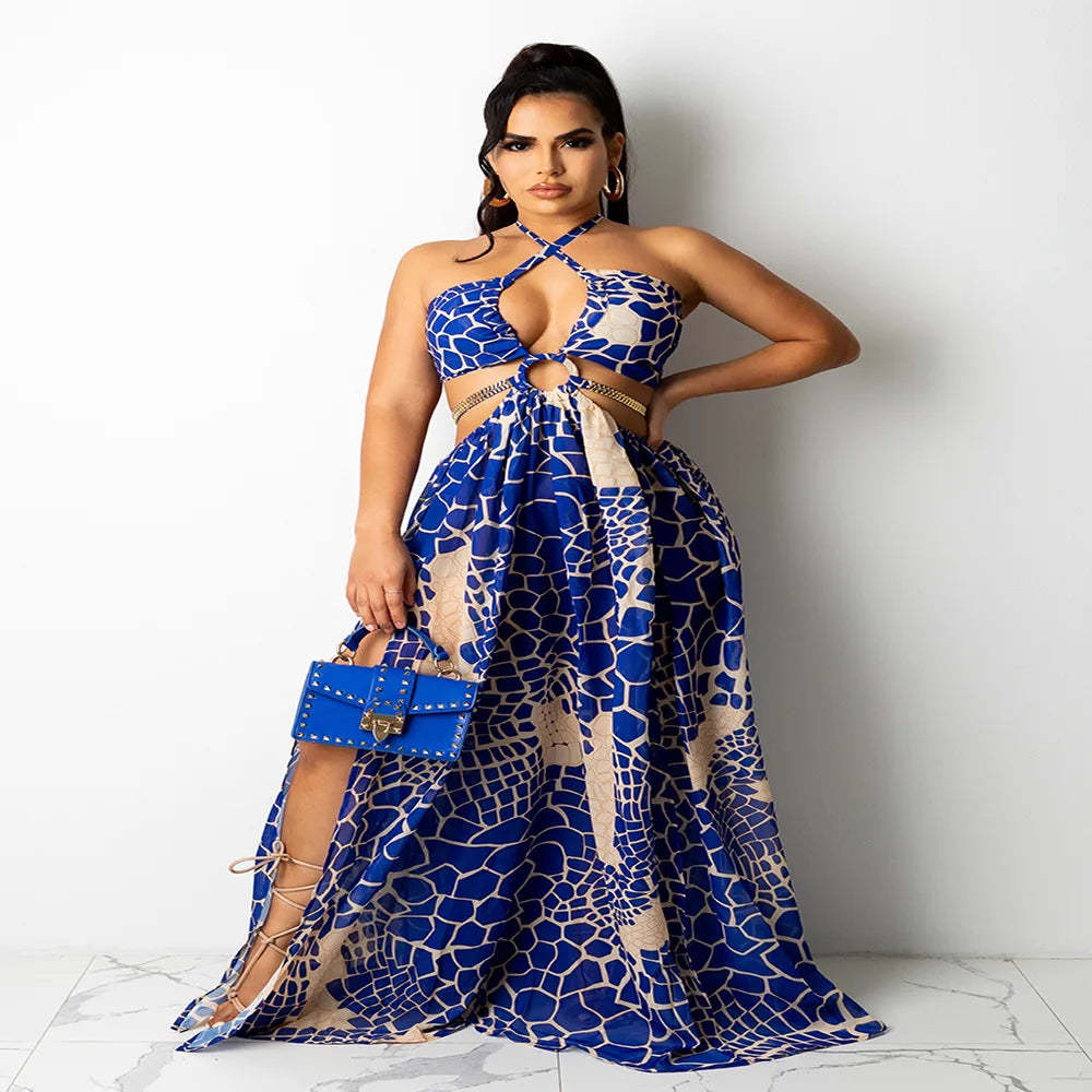 Print Sleeveless Halter Bandage Hollow Out Splited Maxi Dresses