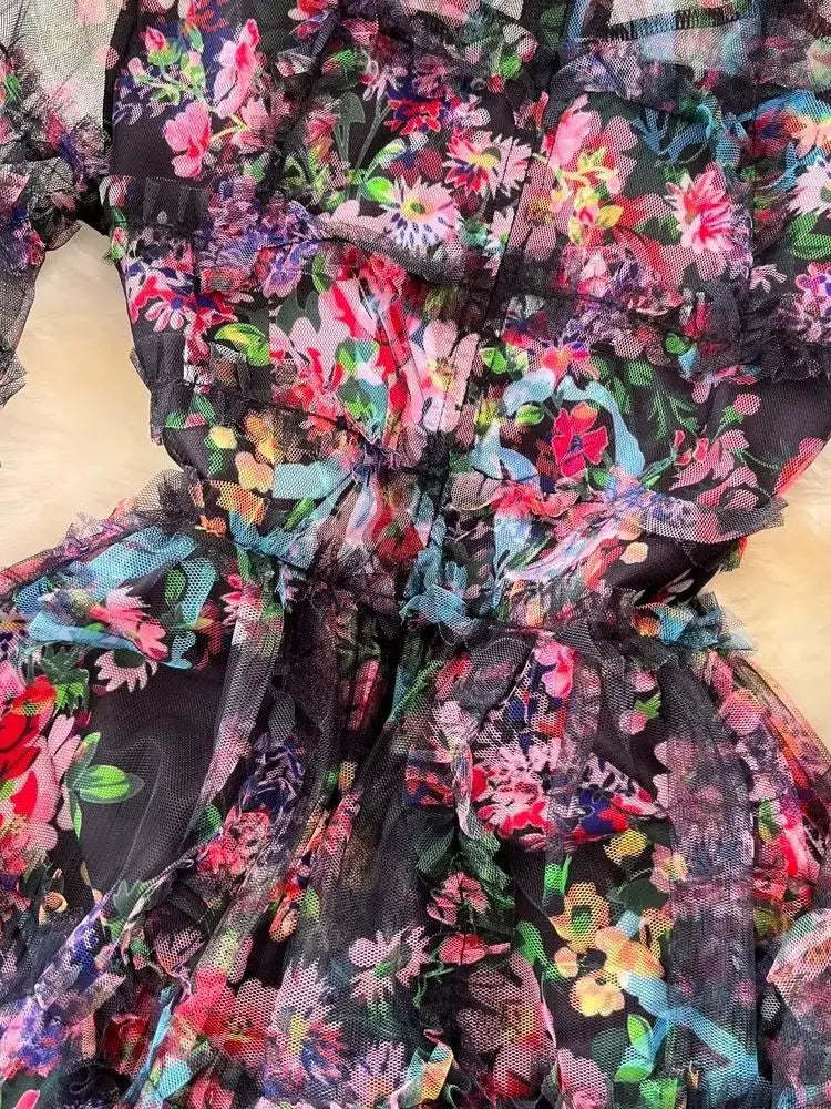 French Elegant Print Gorgeous Flower Cascading Ruffles Long Dress