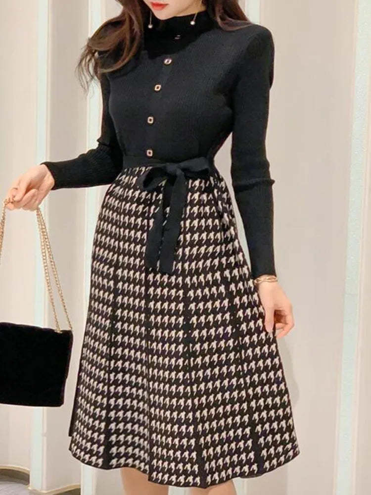 This elegant autumn dress features a slim A-line silhouette crafted from a comfortable knit blend of polyester and cotton. Designed with a classic plaid patchwork pattern, it offers a slight stretch for ease of movement. The mid-calf length and full sleeves complement the O-neck and lace-up bow details, creating a refined yet casual look. Perfect for cooler seasons, this pullover dress combines sophistication with comfort, making it an ideal choice for stylish women seeking timeless autumn wear. Made in Guangdong, China.