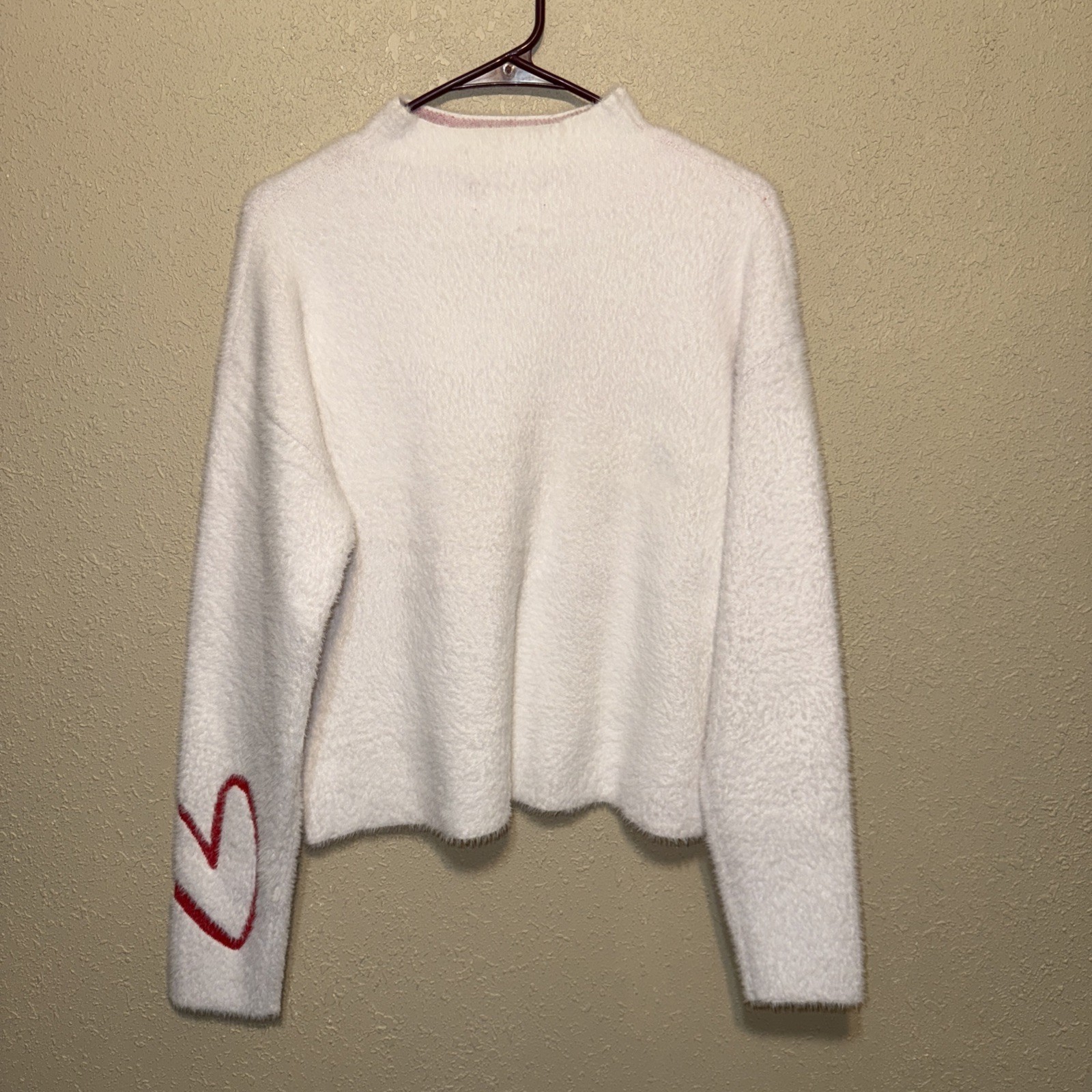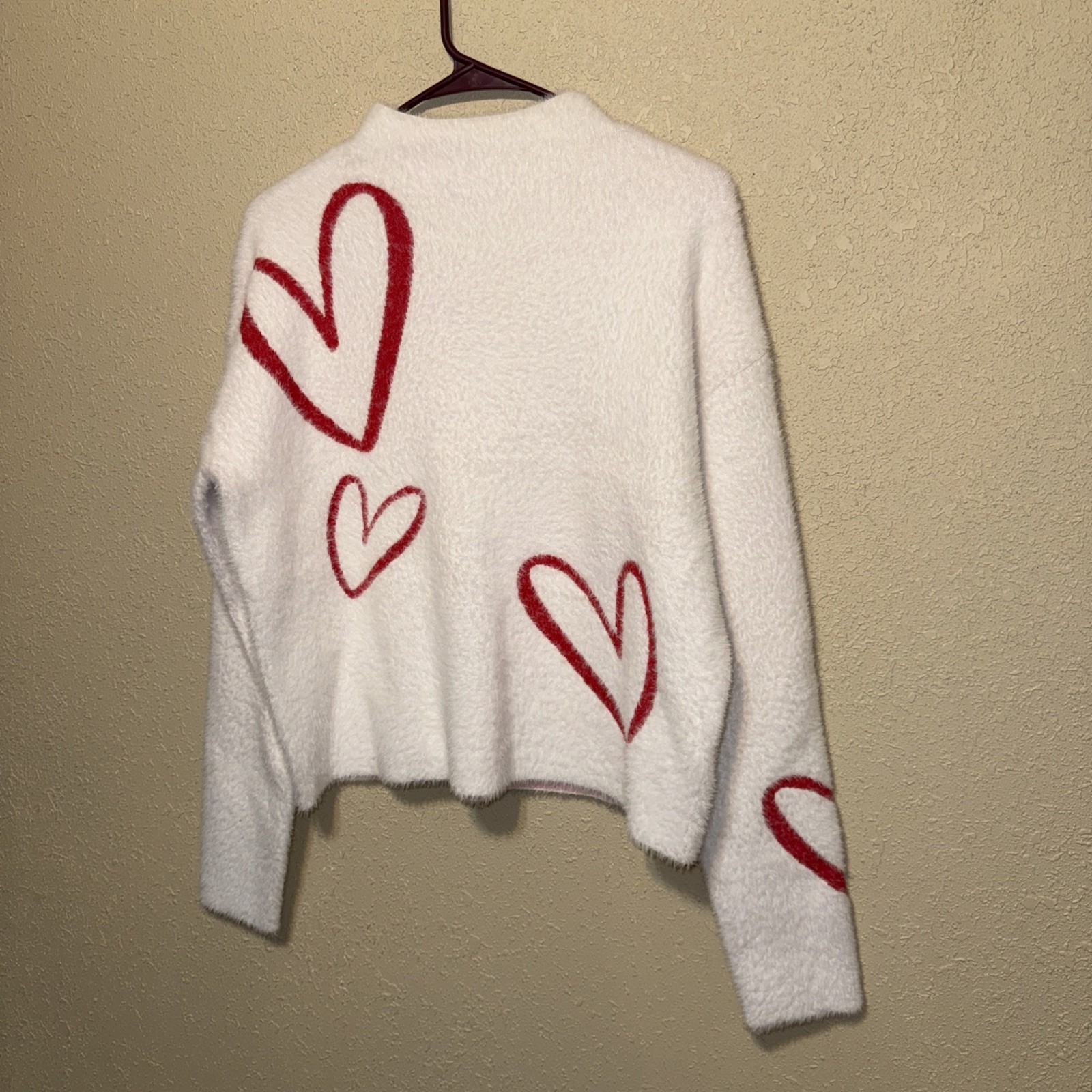 Rachel Zoe RED Hearts Print Pullover Mock Neck Sweater Long Sleeve White sz L