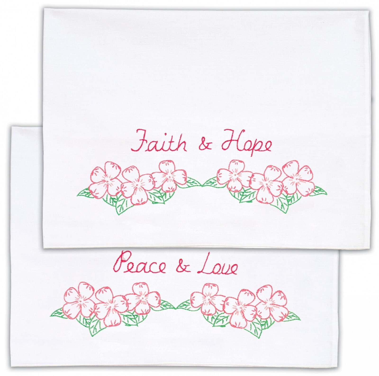 Jack Dempsey Needle Art Faith, Hope, Peace and Love Perle Edge Pillowcases.