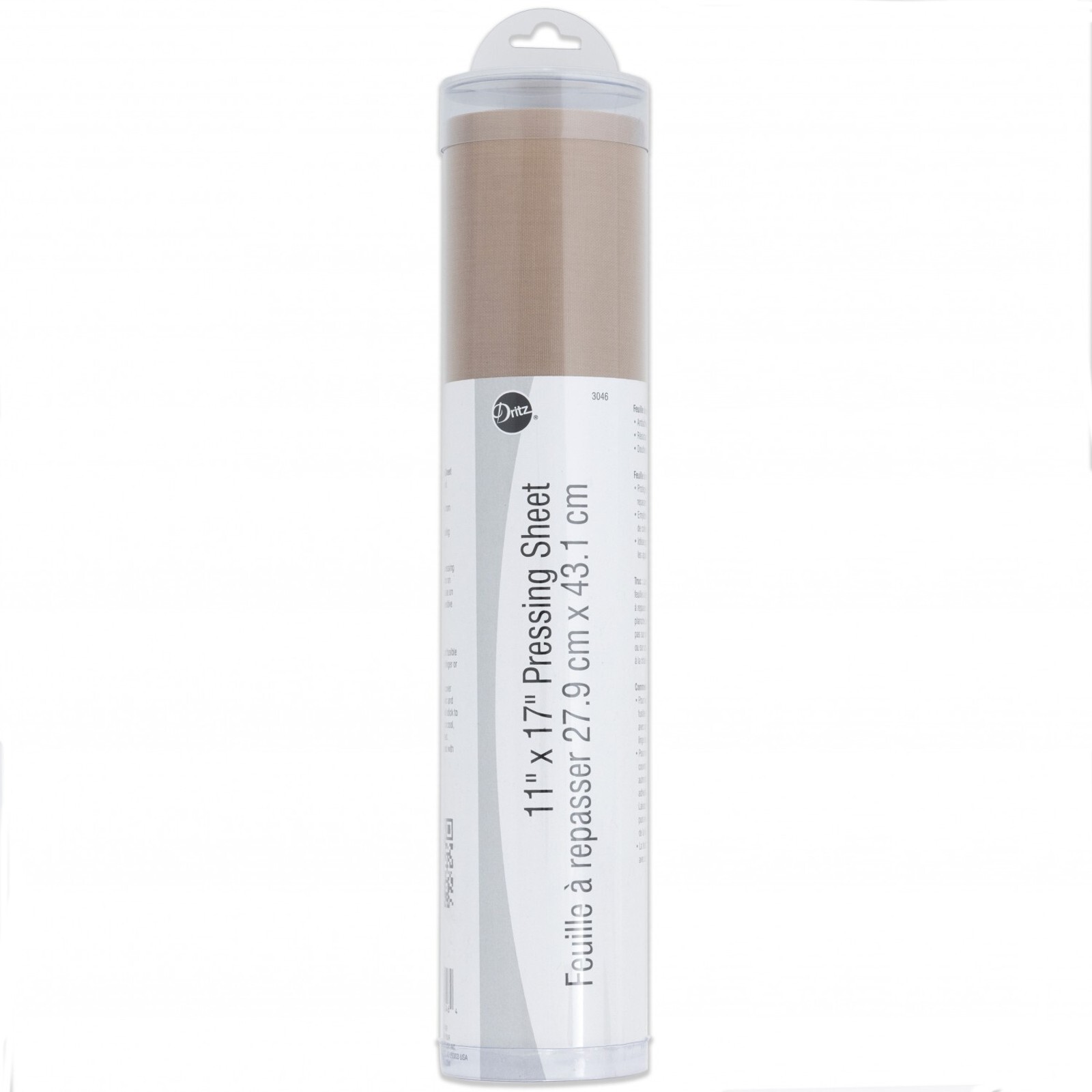 Dritz 11 Inch x 17 Inch Pressing Sheet 3046. This double-sided, non-stick pressing sheet can be placed under or over a project to protect pressing surface and prevent fusibles from sticking to the iron. Durable, heat resistant, Teflon construction. Reusable, easy to clean, smooth surface. Transparent for easy viewing when pre-assembling fusible applique. Use as press cloth with a dry iron on ironing board or protected surface. Creates a craft work surface when using paints and glues. Protects pressing and work surfaces. Prevents fusible web from sticking to iron. Ideal for pre-assembling fusible appliques. Package contain: 1 Pressing Sheet. Size: 11 inches x 17 inches. CHK-3046