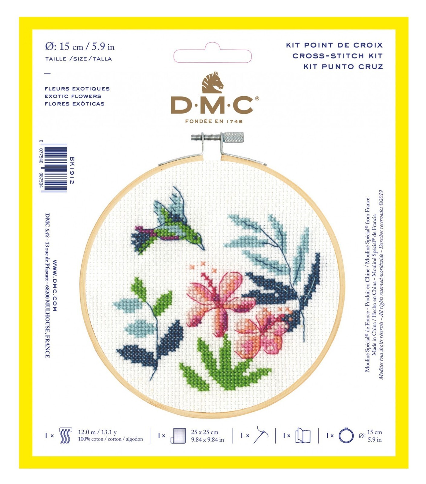 DMC Beginners Cross Stitch Kit XS Exotic Flowers BK1912. A beginner?s dream, this little kit brings BIG value. The DMC Stitch Kit Collection provides all you need to make this inspired design your own. Kit Includes Everything You Need: 9.8in x 9.8in (25 x 25 cm) 14 Count - 100 Percent Cotton, Aida Cloth, 6in. Bamboo Hoop, DMC Embroidery Floss, Tapestry Needle, and Complete Instructions. Design features: A hummingbird with several exotic flowers. Finished Size: 9.8 inches x 9.8 inches. CHK-BK1912L