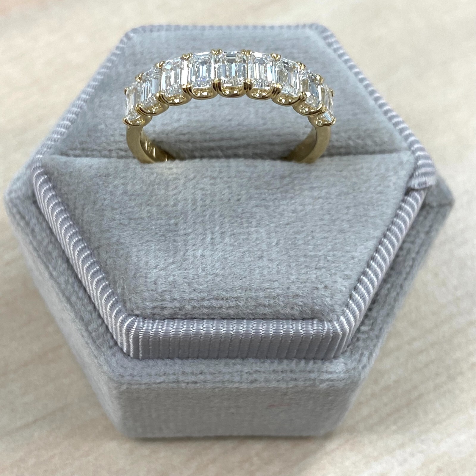 Questa fede nuziale a forma di U a forma di U e un'espressione abbagliante di amore e impegno. Realizzato in splendido oro solido 14K, presenta nove diamanti coltivati ??da laboratorio a taglio smeraldo, ciascuno saldamente tenuto in un ambiente di polo classico. Il peso totale dei carati e di 1,75 carati.