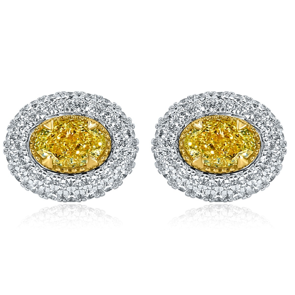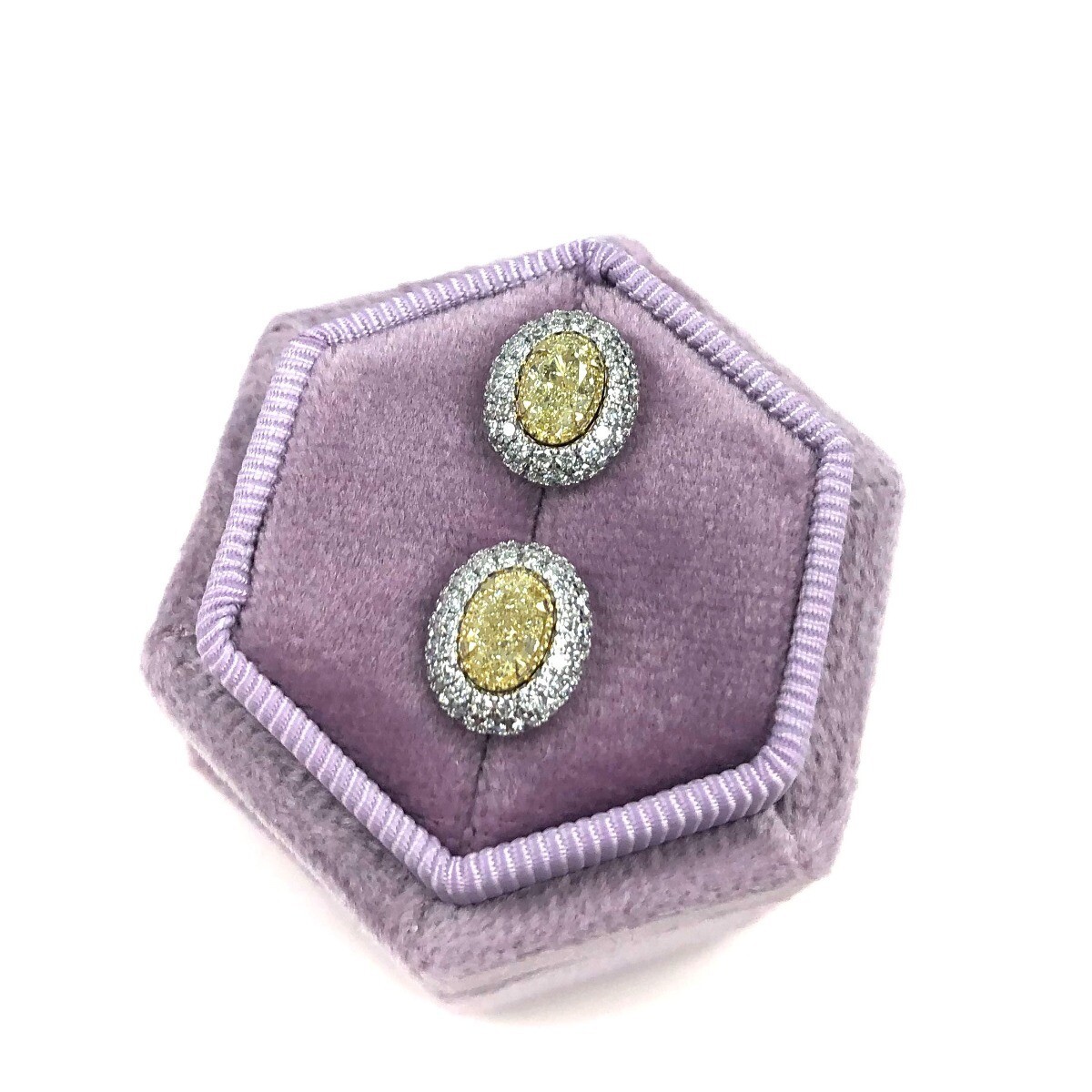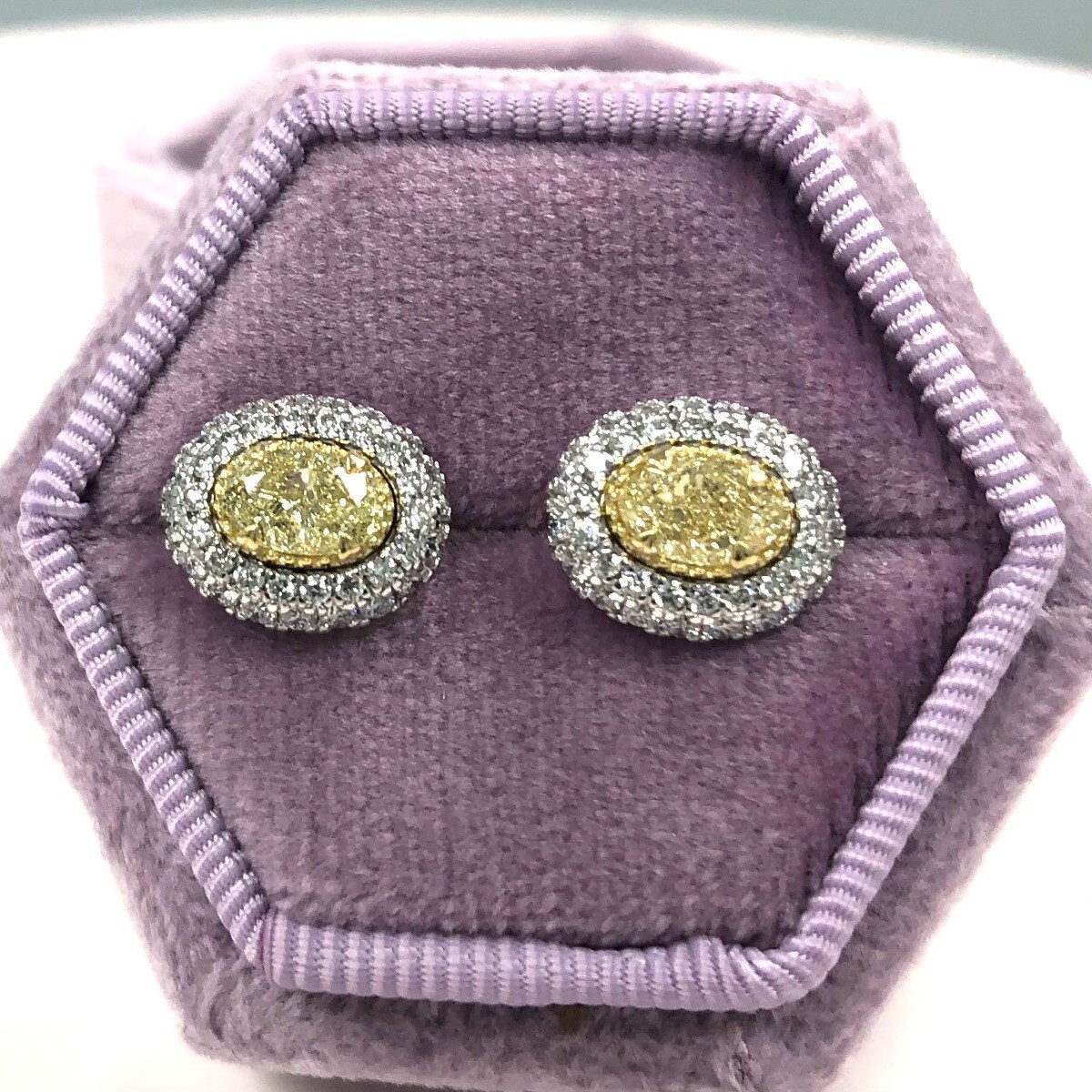 ¡Los encantadores pendientes de sementales agregaran magia al momento especial! Estos pendientes cuentan con 1.01 quilates de diamantes de diamante amarillo de corte ovalo de cutava rodeados por un halo doble de diamantes de corte redondo incoloro en micro pavimento. Hecho a mano en oro múltiple de 14k de oro y seguro con el cierre del tornillo. El peso total de quilates es de 1.85 quilates.