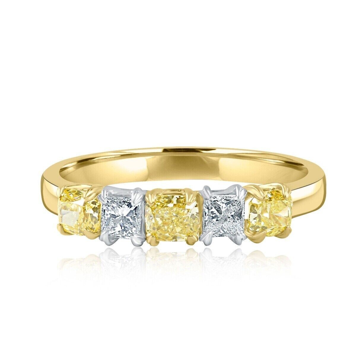 Esta deslumbrante alternativa de boda alternativa cuenta con diamantes de 0.90 quilates. ¡Cada uno de los diamantes se coloca en la configuracion de punta compartida, una de las configuraciones mas seguras! Esta alianza de boda de diamantes de cinco piedras de moda presenta oro de 18k dos tonos con 0.64 quilates cortados de cojín amarillo natural con diamantes naturales de corte incoloro de princesa en forma de forma de punta. El ancho superior es de 4.0 mm, el ancho del vastago es de 2.3 mm, la banda esta en el tamaño 7. La banda tiene un diseño Art-Deco con un alto acabado polaco para un efecto brillante. Todos nuestros productos estan hechos a mano con calidad y cuidado, en el corazon del Distrito de Diamantes en la calle 47 en la ciudad de Nueva York. Nuestra dedicacion y compromiso co