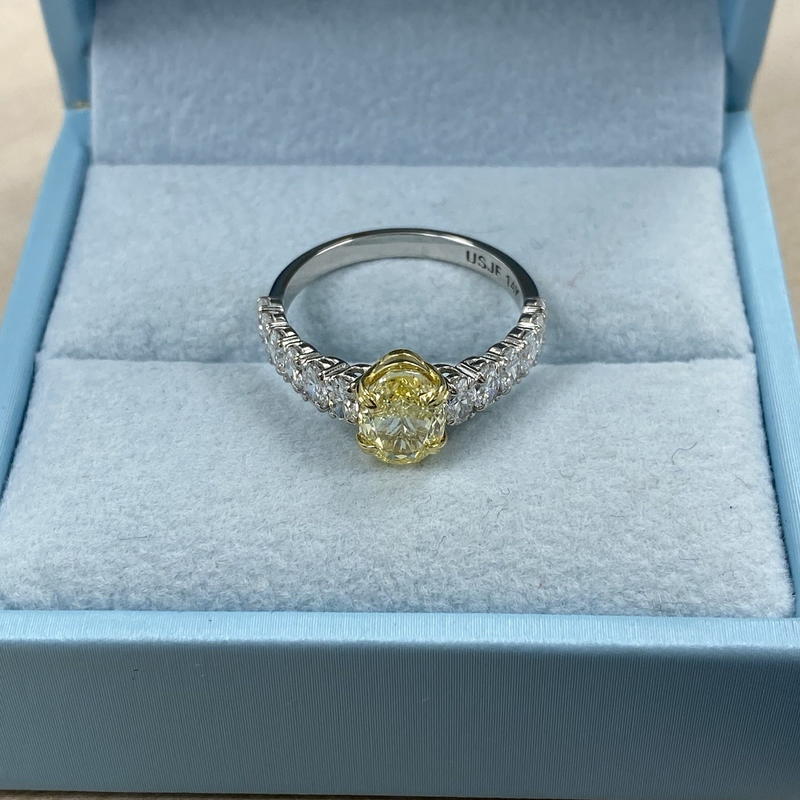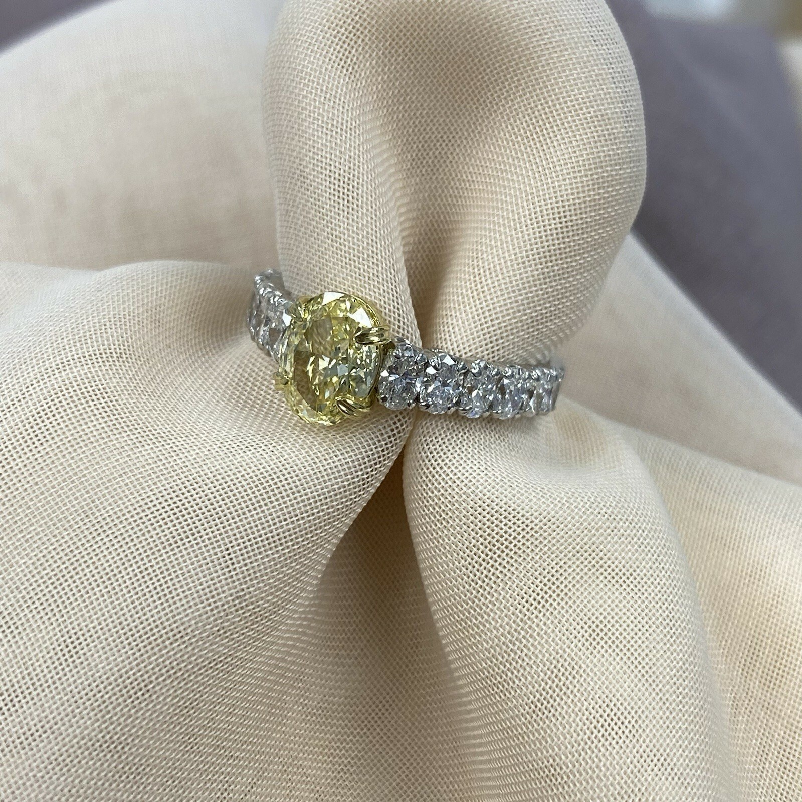 ¡Haga una declaracion audaz con este exquisito diamante de laboratorio amarillo de Cut Igi Cut Igi Cut IGI en el centro, irradiando tonos vibrantes de romance y elegancia! ¡Complementado por diamantes incoloros mas pequeños de laboratorio de corte ovalado en los lados, este diseño ofrece una combinacion excepcional de brillantez y sofisticacion! Hecho en oro de 14k blanco, con delicados acentos de oro amarillo de 18k, ¡este anillo es una opcion impresionante para aquellos que aprecian la belleza única y el lujo moderno! Todos nuestros productos estan hechos a mano con calidad y cuidado, en el corazon del Distrito de Diamantes en la calle 47 en la ciudad de Nueva York. Nuestra dedicacion y compromiso con el buen trabajo y la calidad excede a todos los demas. Dado que todos nuestros producto