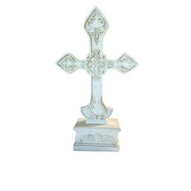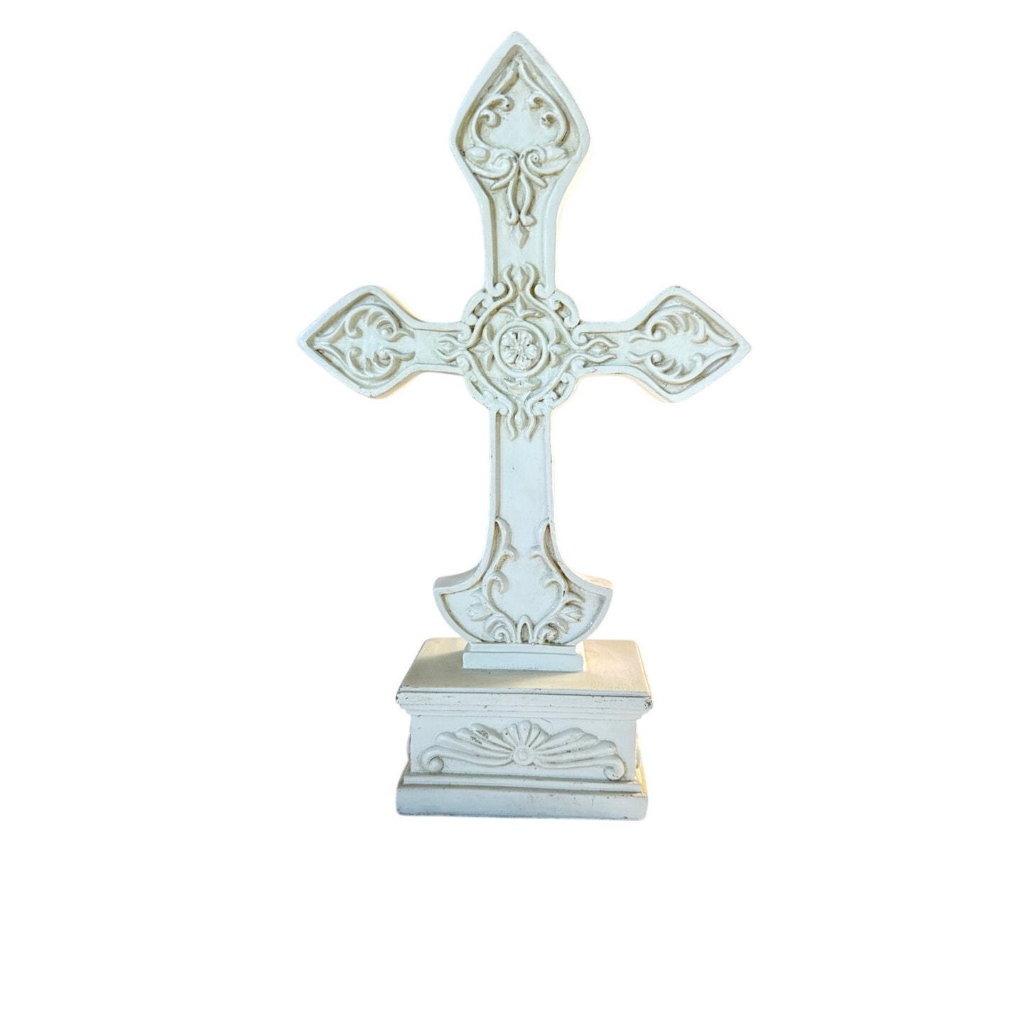 Statement tabletop cross with ornate carved details and a square pedestal base. Distressed white finish fits farmhouse, shabby chic, and French country decor. Sturdy and ready to display on a mantel, entry table, or altar.
