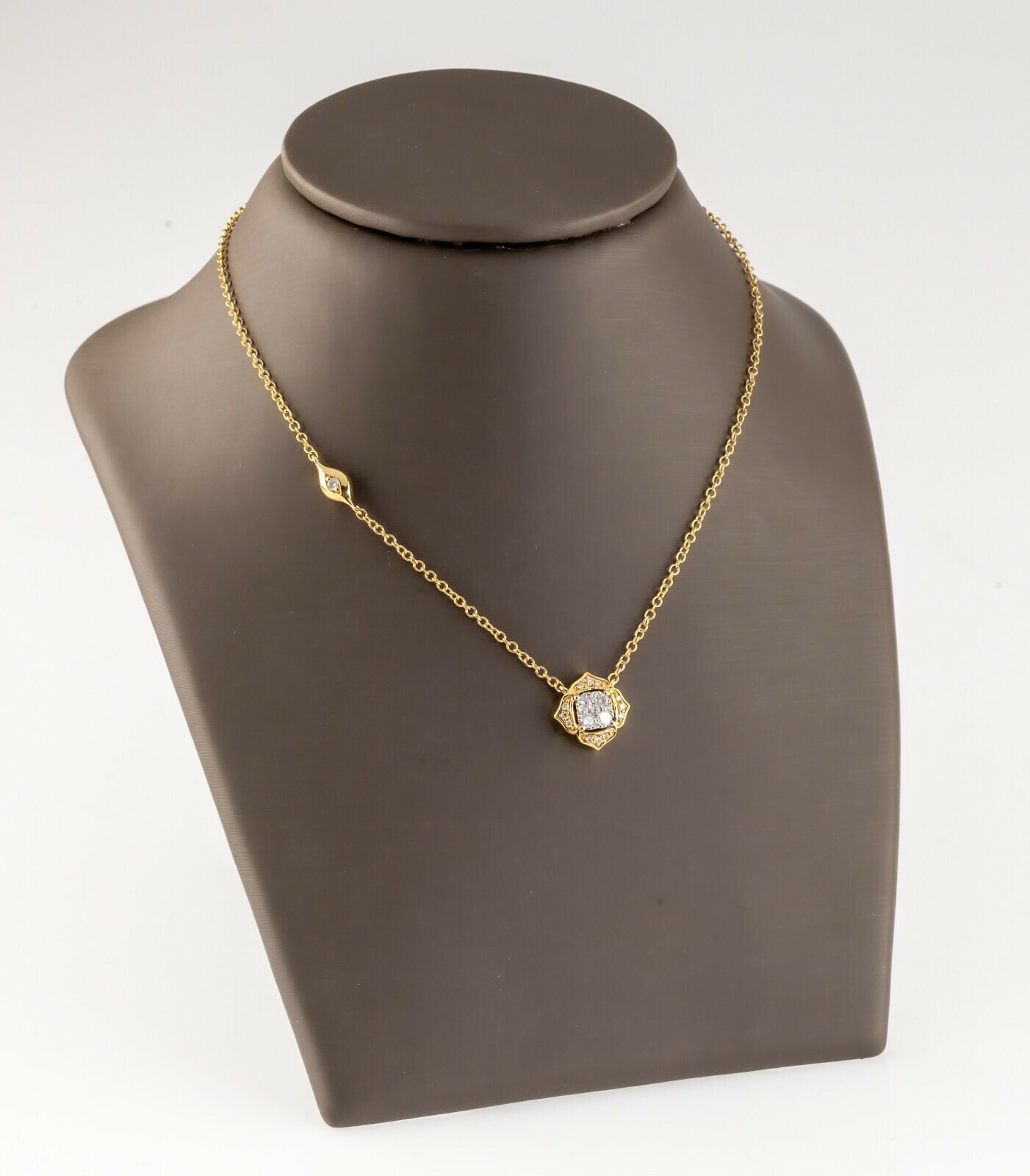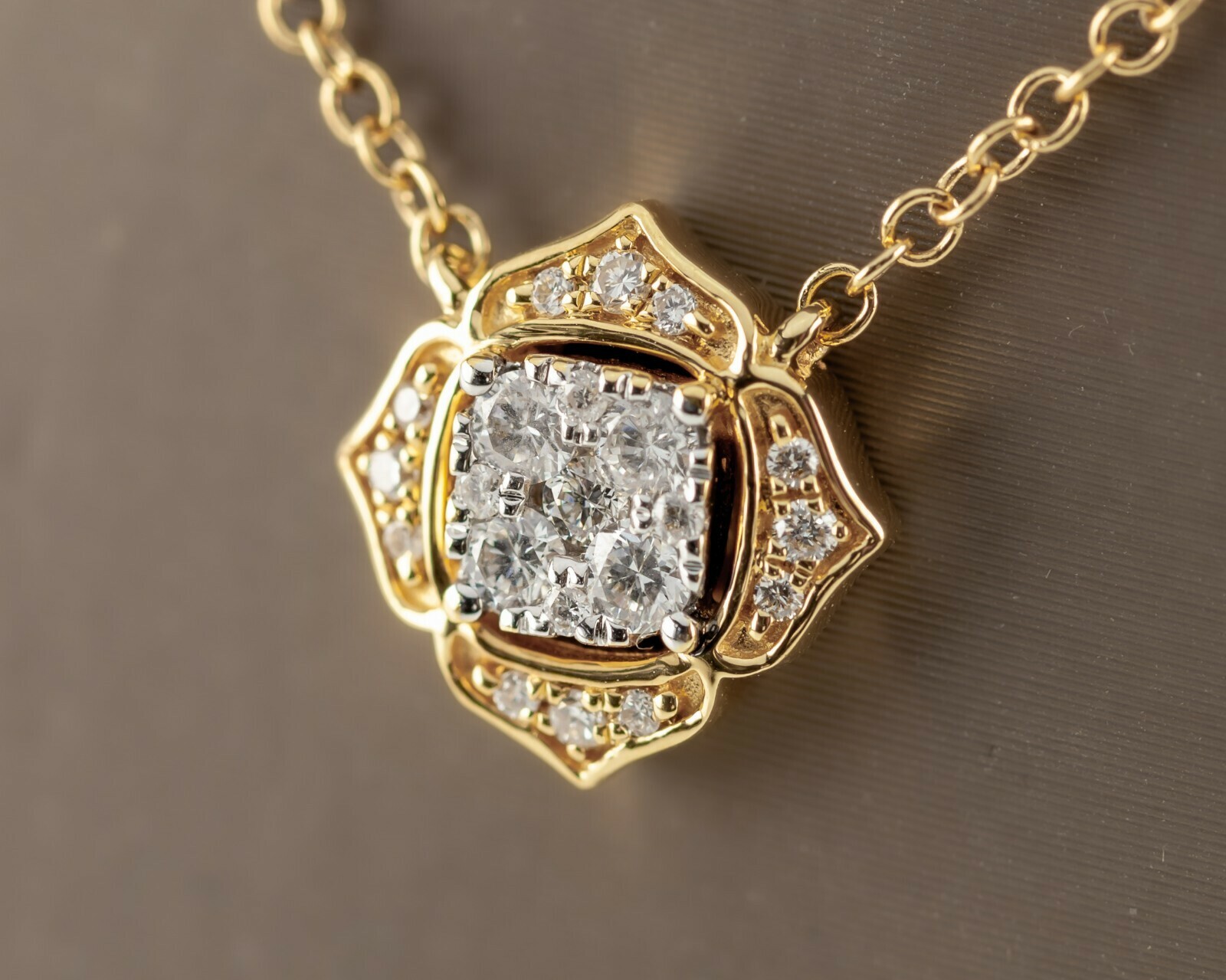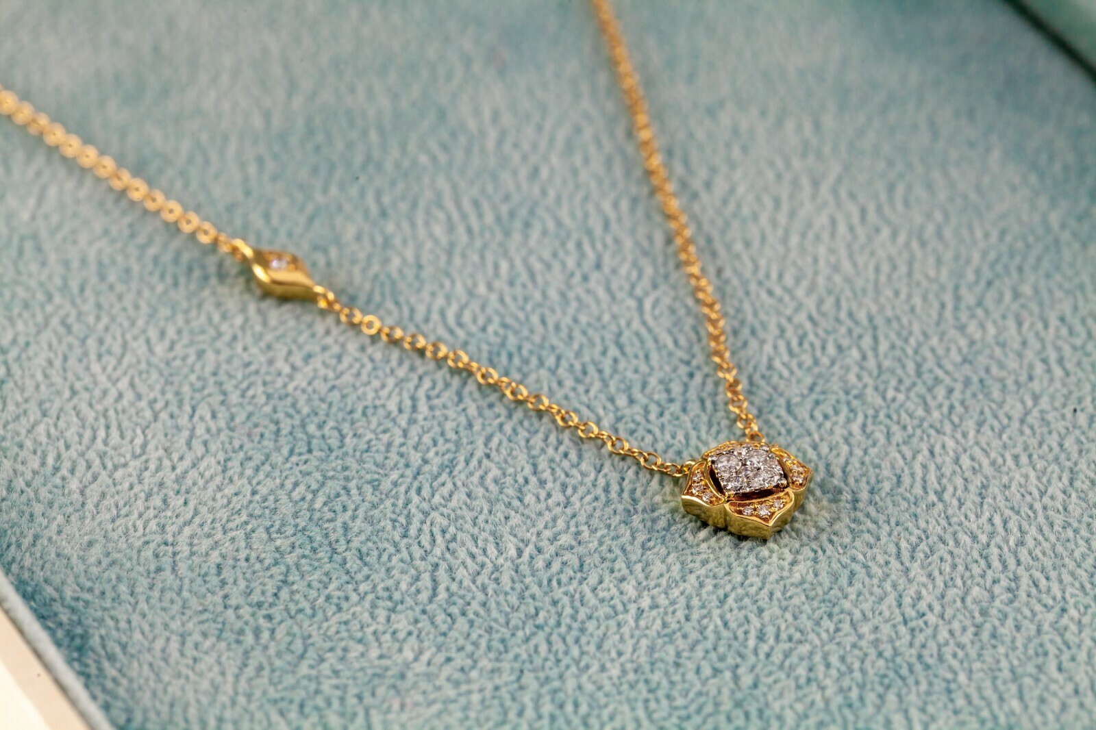 Features Floral Pendant with Pave Diamonds and Extra Diamond Motif on Chain