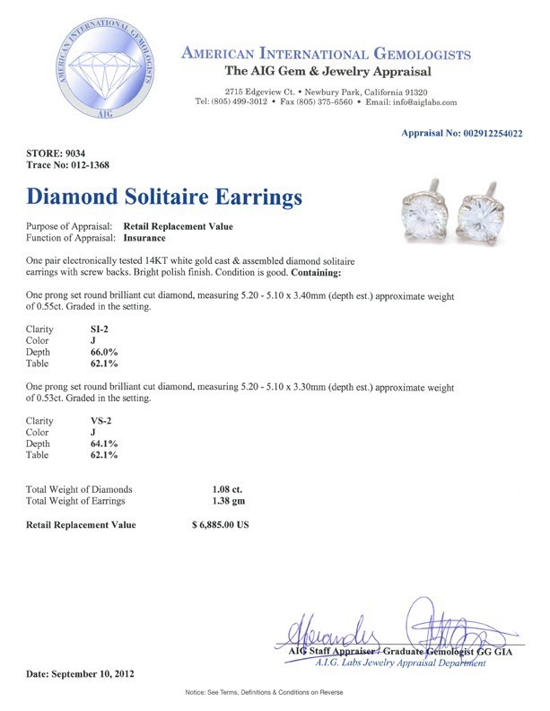 One Pair Electronically Tested 14KT White Gold Cast Assembled Diamond Solitaire Earrings