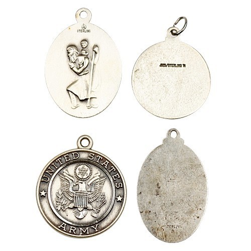 FOUR (4) VINTAGE STERLING SILVER DIFFERENT SAINT MEDALLIONS / PENDANTS 1ST ITEM MEASUREMENTS: 3/4" Diameter 1ST ITEM FEATURES: "St. Christopher Protect us" Round Medallion. 2nd ITEM MEASUREMENTS: 7/8" Diameter 2nd ITEM FEATURES: United States Army "Saint Christopher Protect Me" Round Medallion. 3RD ITEM MEASUREMENTS:1" L x 3/4" W. 3RD ITEM FEATURES: Baseball Players "Saint Christopher Protect Me" Oval Medallion. 4TH ITEM MEASUREMENTS: 1" L x 3/4" W. 4TH ITEM FEATURES: "Saint Joseph Pray For Me" Oval Medallion. 9 % SALES TAX WILL BE ADDED INSURANCE DELIVERY CONFIRMATION OR SIGNATURE CONFIRMATION We appreciate your understanding. Please call us with any Inquiries: Continental Coin and Jewelry Company Web Department: Monday - Friday, from 10:30 am - 6 pm (818-781-4232) Reference Item # A0