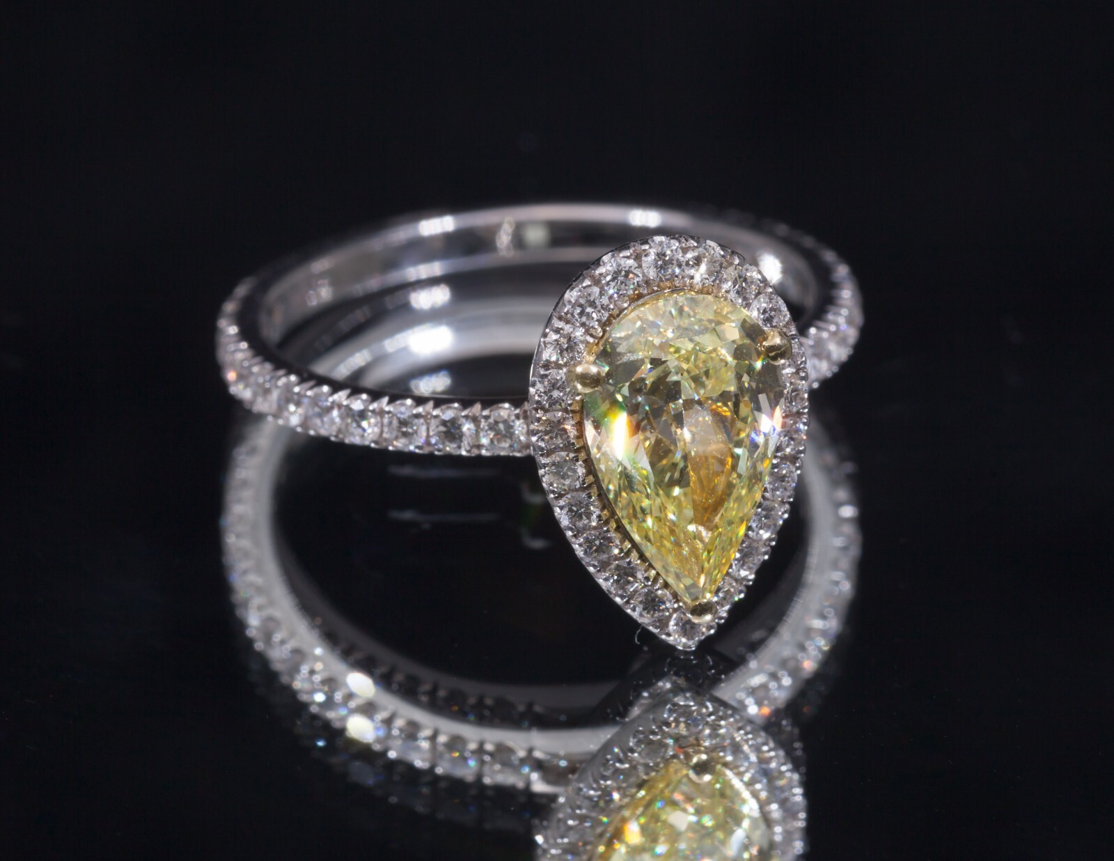 1.19 Carat Pear Shape Fancy Yellow Diamond in 18k White Gold Band.69 Ct Accents