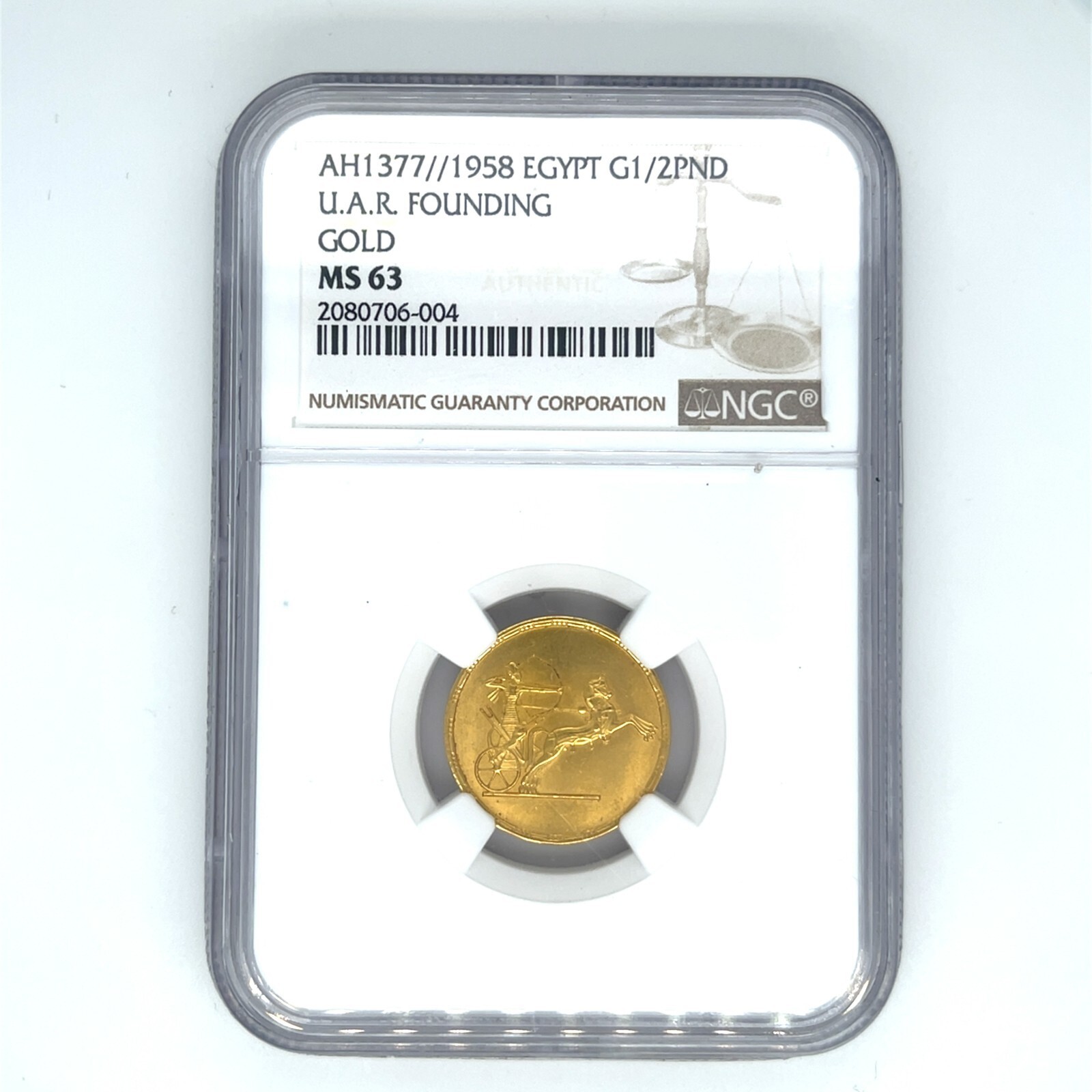 1958 Oro egiziano 1/2 sterlina UAR Moneta d'oro fondatrice classificata da NGC come MS-63