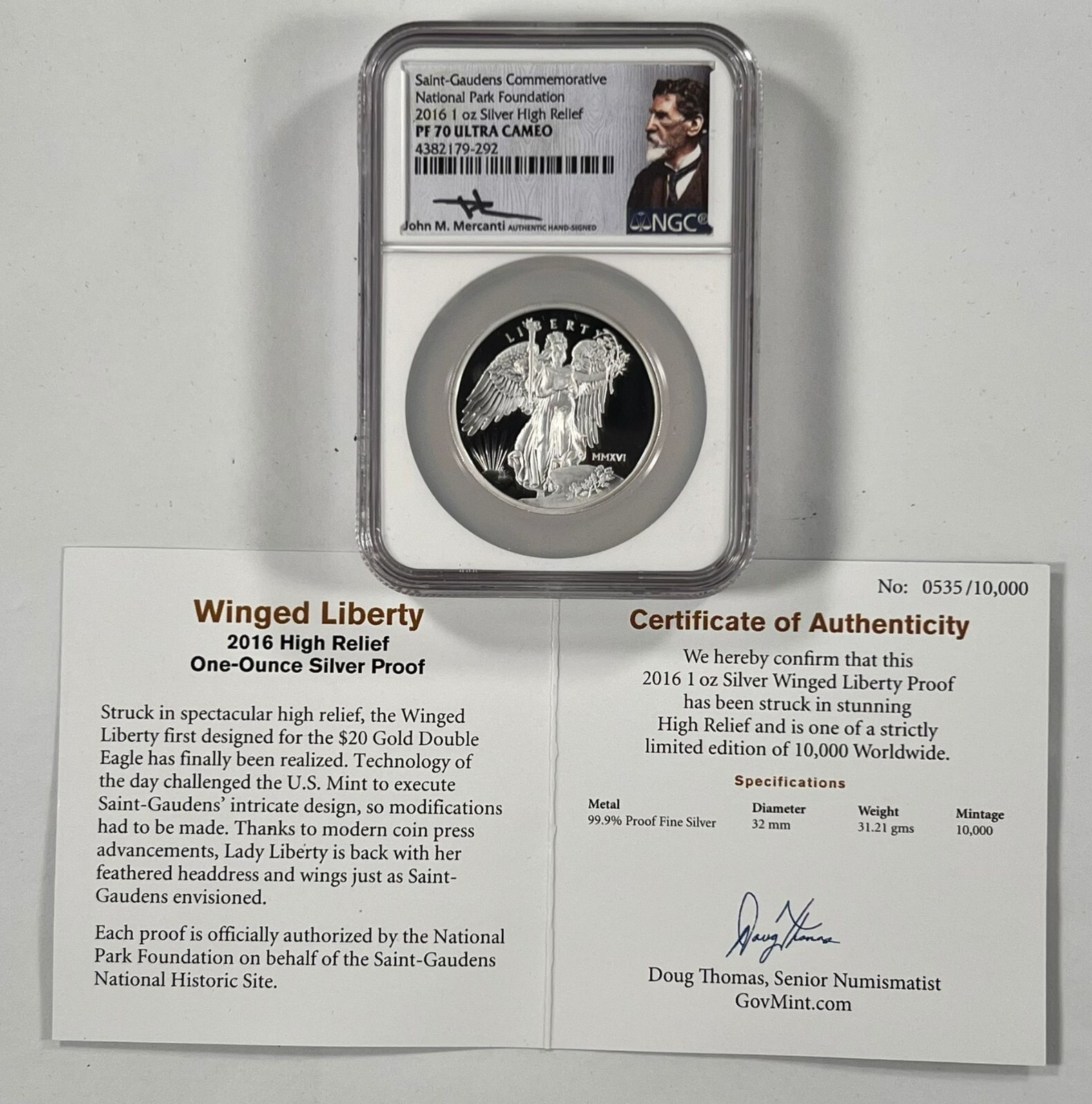 2016 1 oz. Silver High Relief Saint-Gaudens Commemorative Pf70 Ultra Cameo CoA
