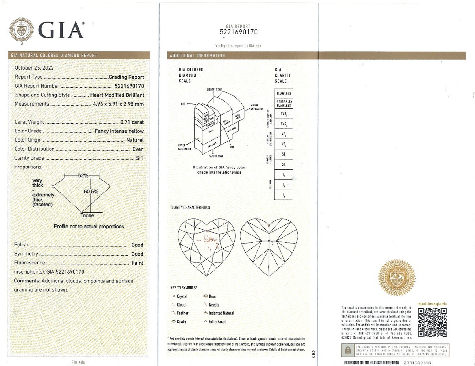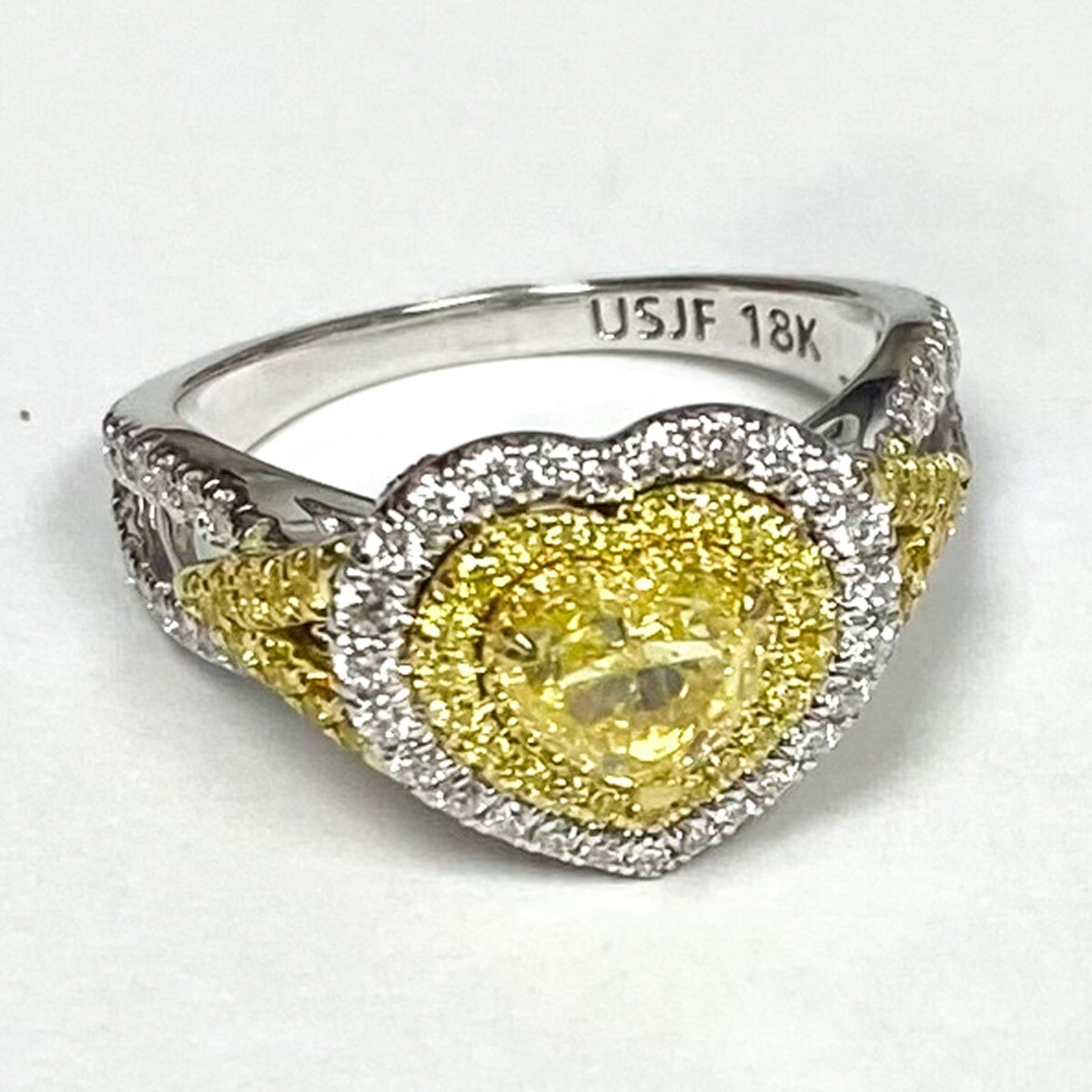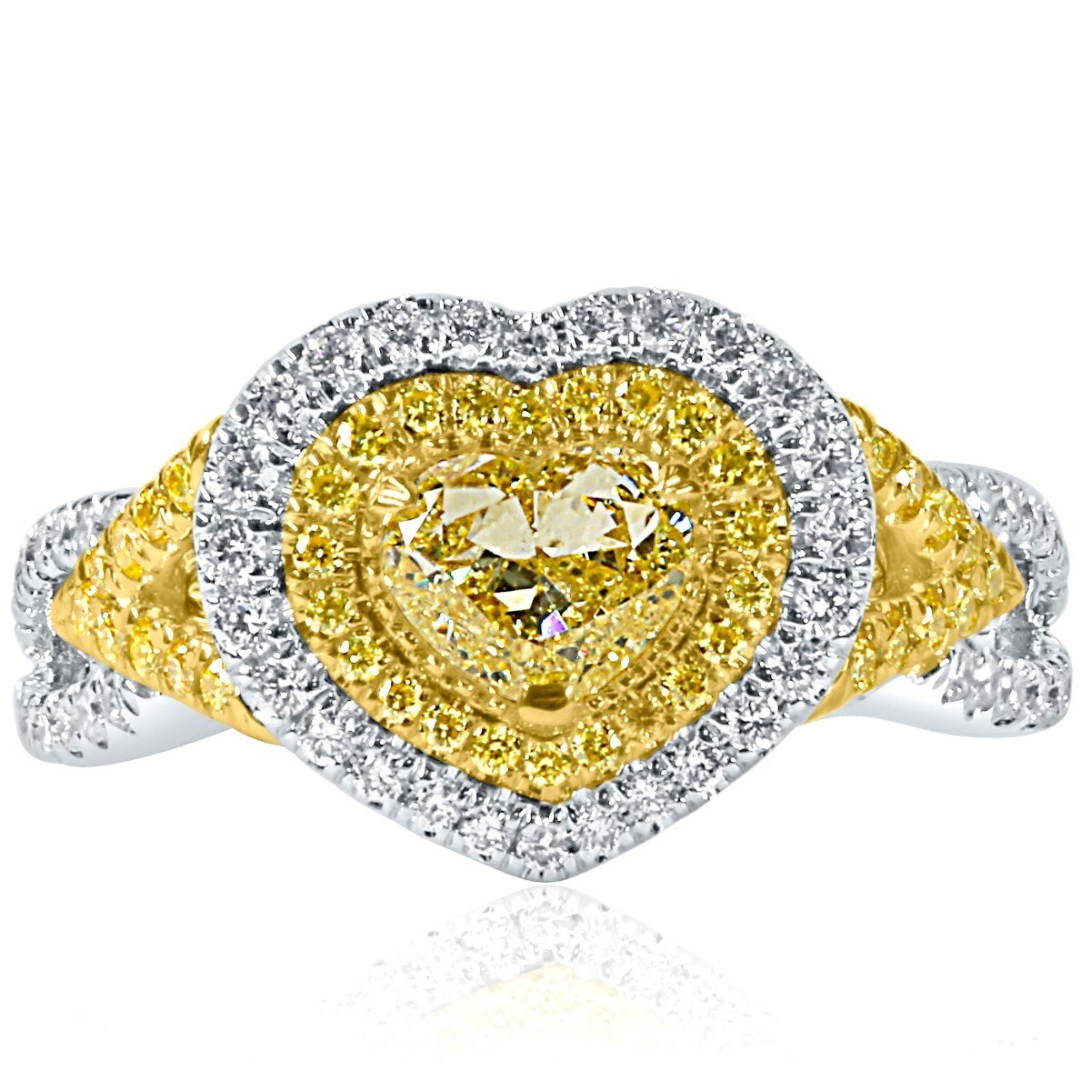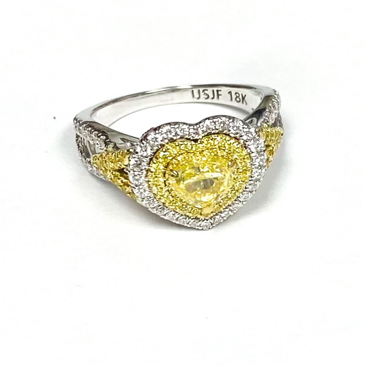 This art piece provides a beautiful spin on the elegant halo set GIA certified heart cut diamond ring. White and yellow diamonds serve as an accent for the center stone and also add shine to the 18k multi-tone gold band. The center diamond features a 0.71 carat natural fancy intense yellow color. The center stone w/ round brilliant cut yellow and colorless diamonds featuring 0.77 carat in micro pave setting. Presenting the center stone is a diamond encrusted double halo and a modern split shank. The total carat weight is 1.48 carats. The ring comes with Gemological Institute of America Certificate (GIA) # 5221690170 Our products are all hand made with quality and care, in the heart of the diamond district on 47th Street in New York City. Our dedication and commitment to fine work and quali