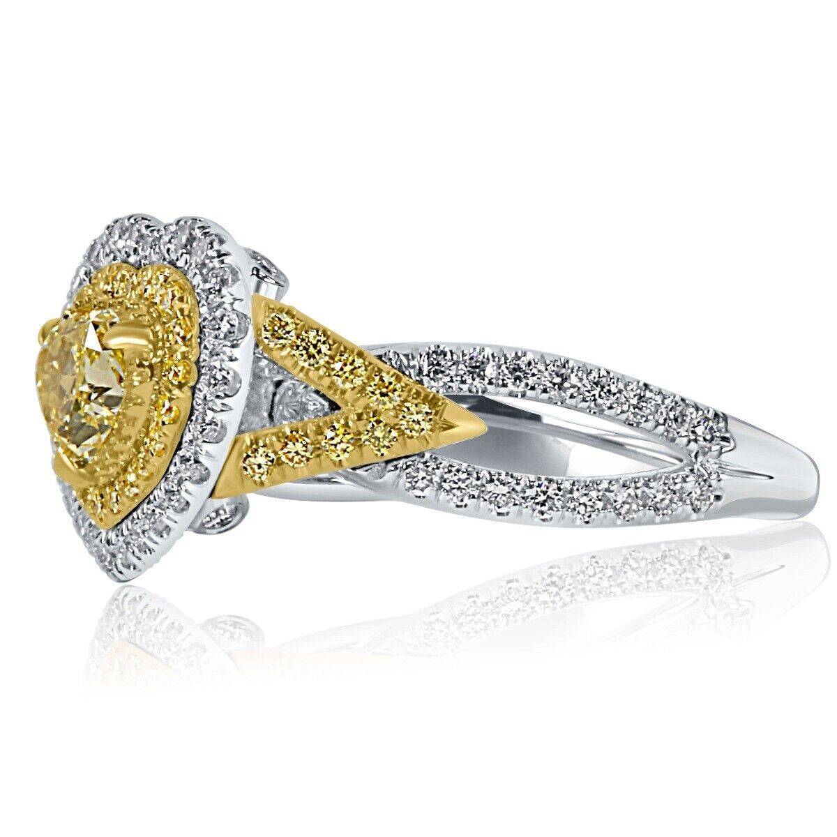 This art piece provides a beautiful spin on the elegant halo set GIA certified heart cut diamond ring. White and yellow diamonds serve as an accent for the center stone and also add shine to the 18k multi-tone gold band. The center diamond features a 0.71 carat natural fancy intense yellow color. The center stone w/ round brilliant cut yellow and colorless diamonds featuring 0.77 carat in micro pave setting. Presenting the center stone is a diamond encrusted double halo and a modern split shank. The total carat weight is 1.48 carats. The ring comes with Gemological Institute of America Certificate (GIA) # 5221690170