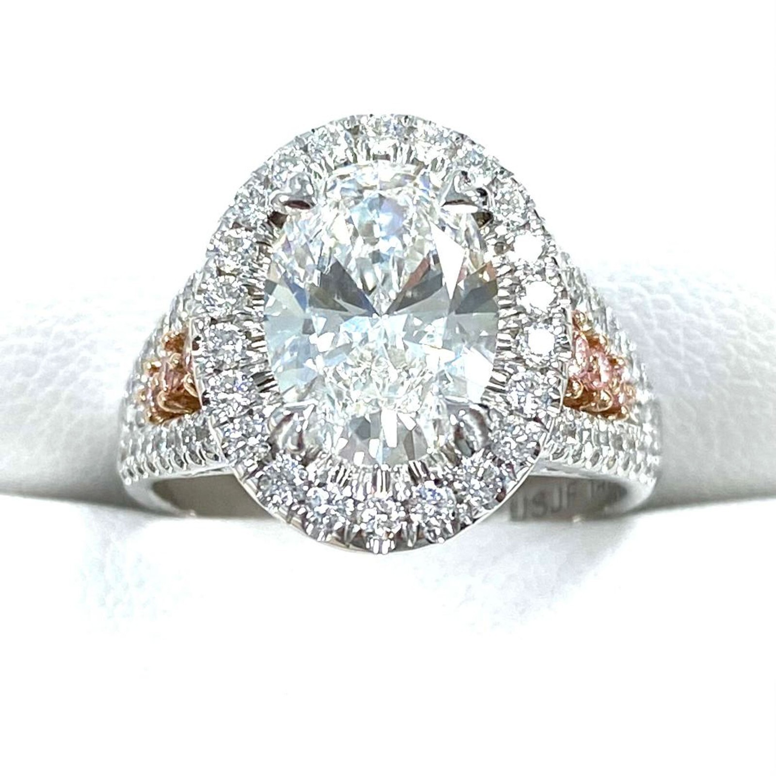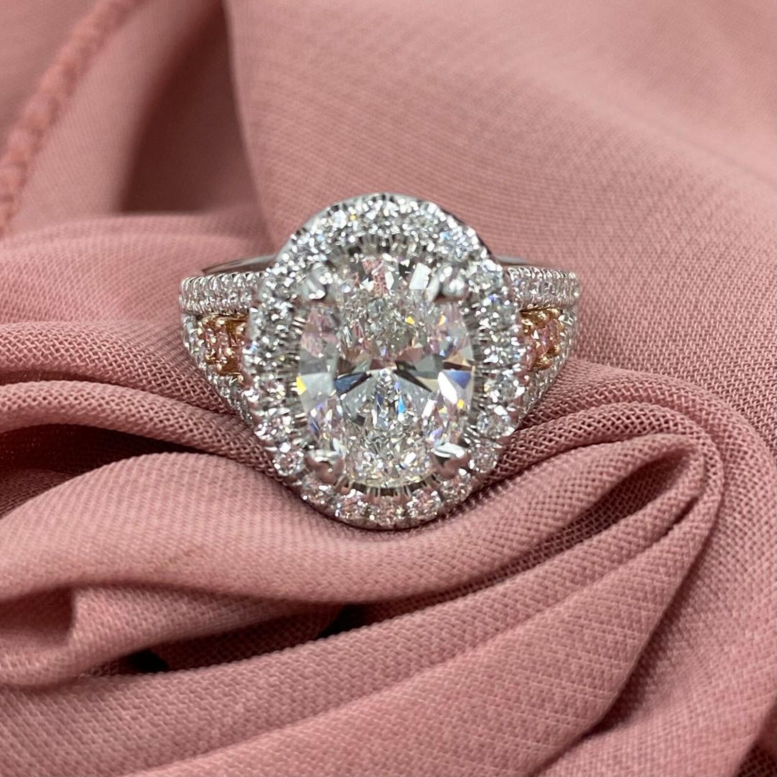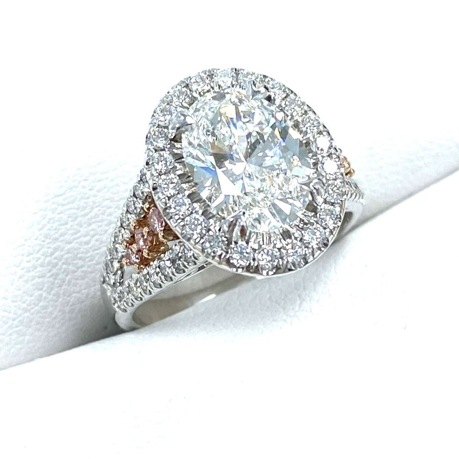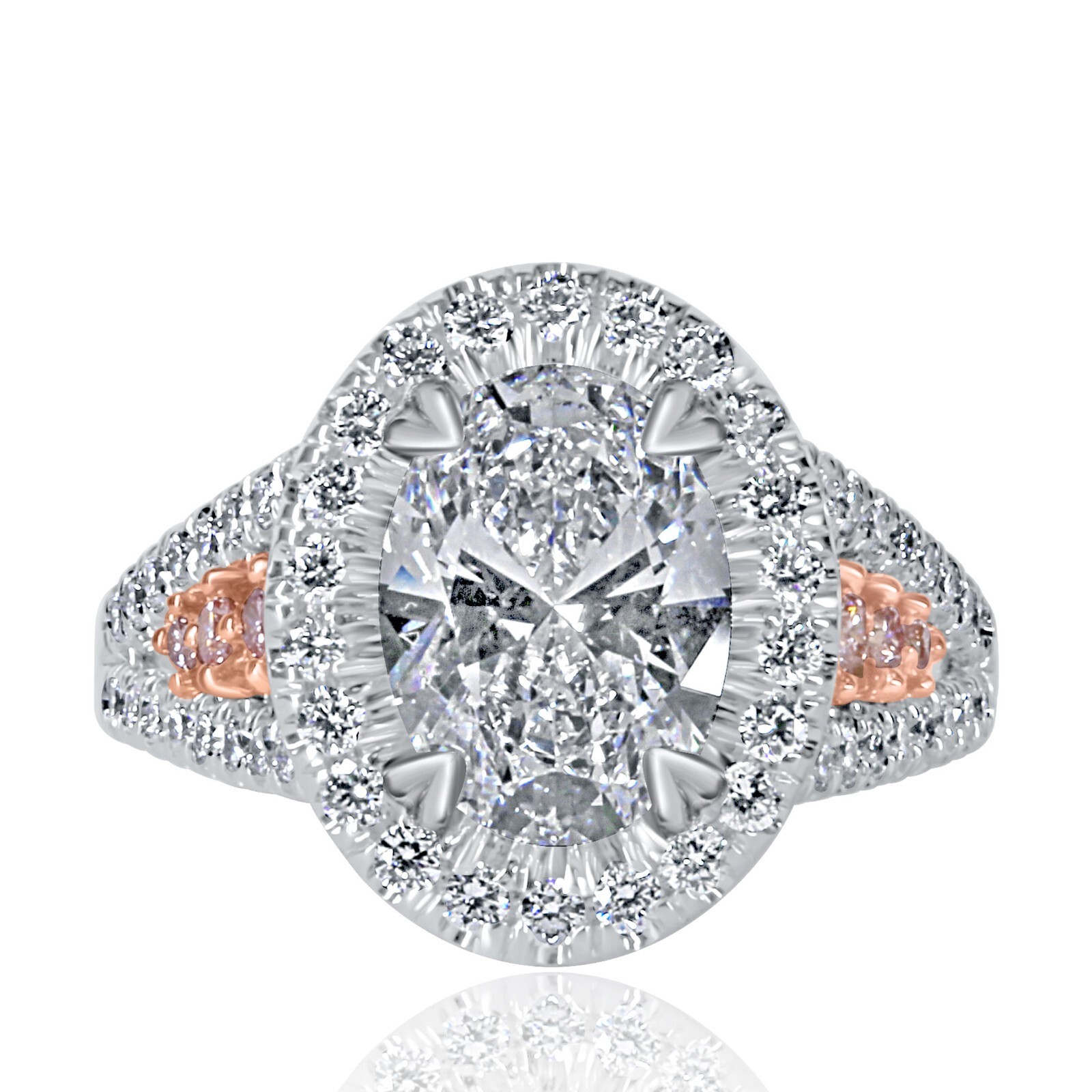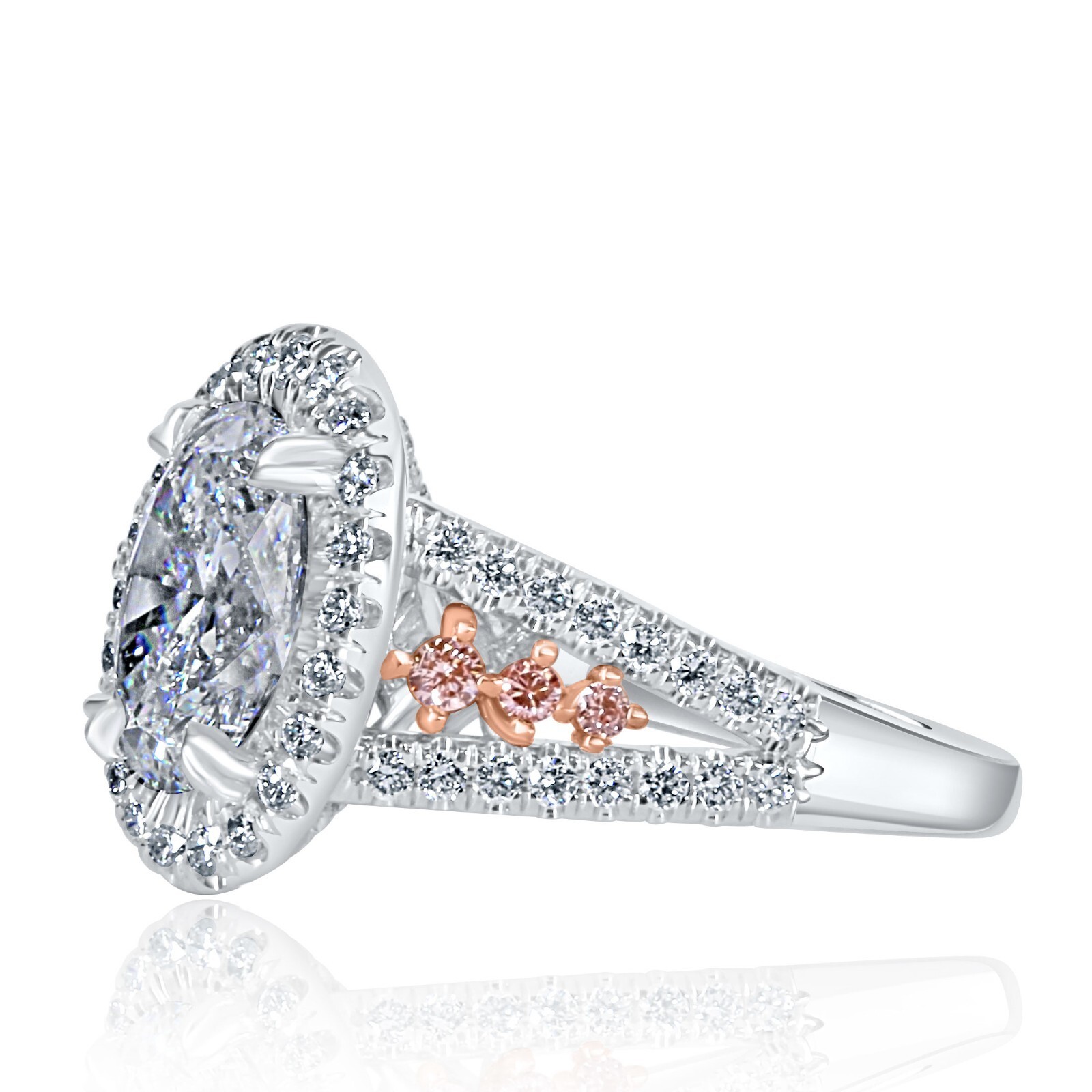 This classic and elegant lab grown diamond engagement ring is features a IGI certified (# LG6254274431) 2.25 carat D color VVS2 clarity center lab grown diamond. The center stone is complemented by 1.01 carat pink and colorless lab grown diamonds along the band and the halo. Handcrafted in 14k white gold. The total carat weight is 3.26 carats.