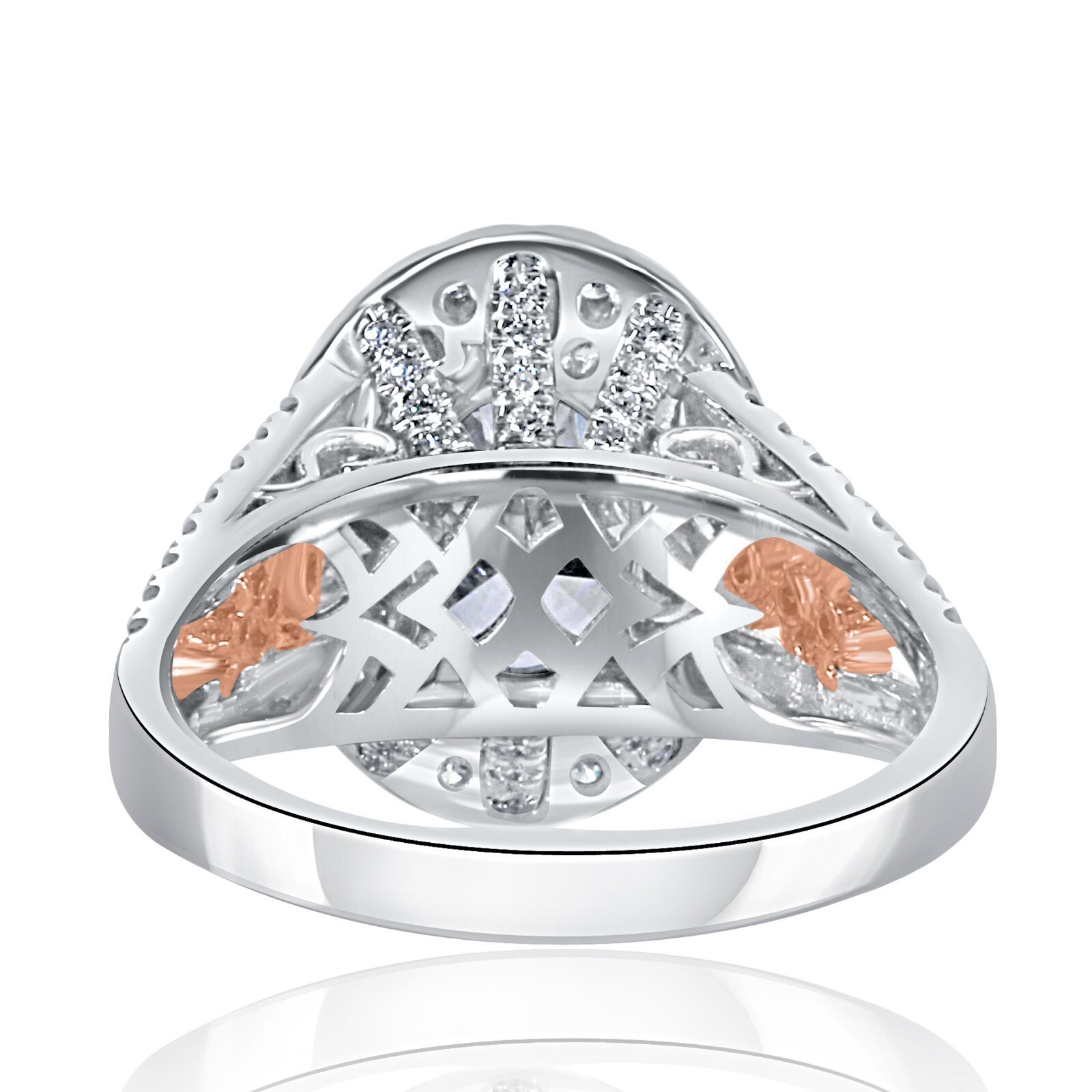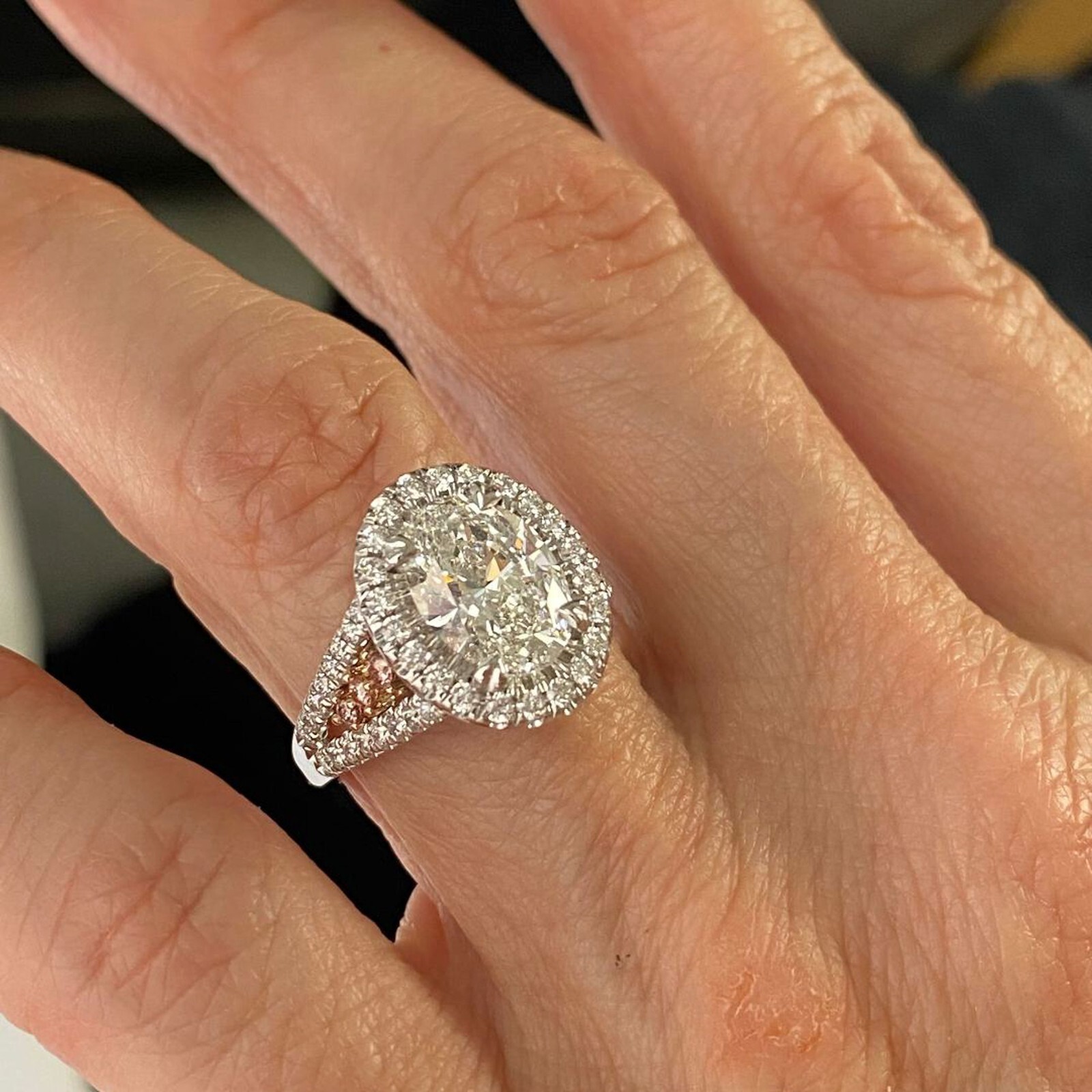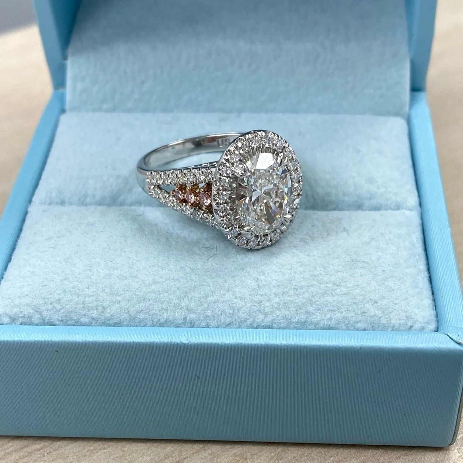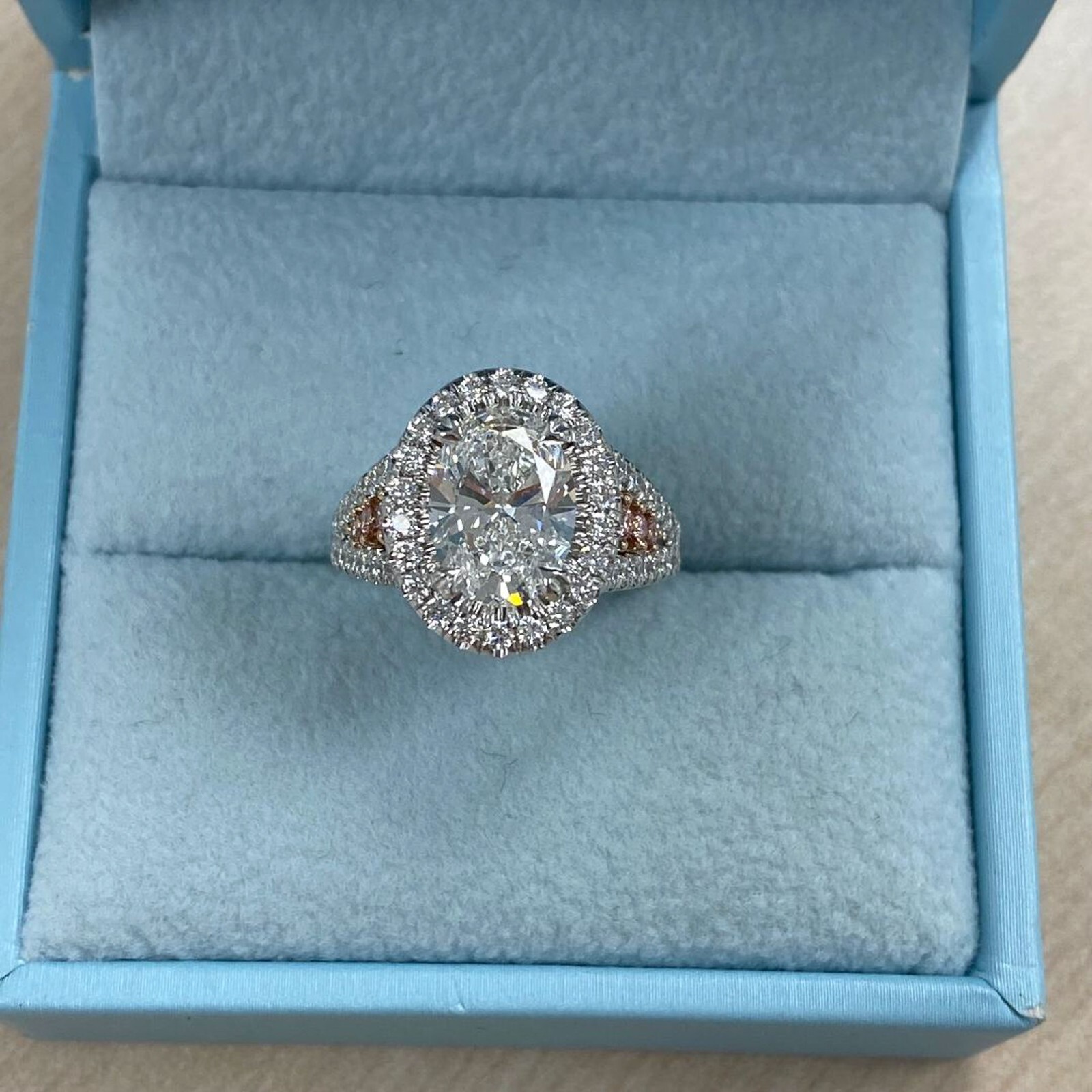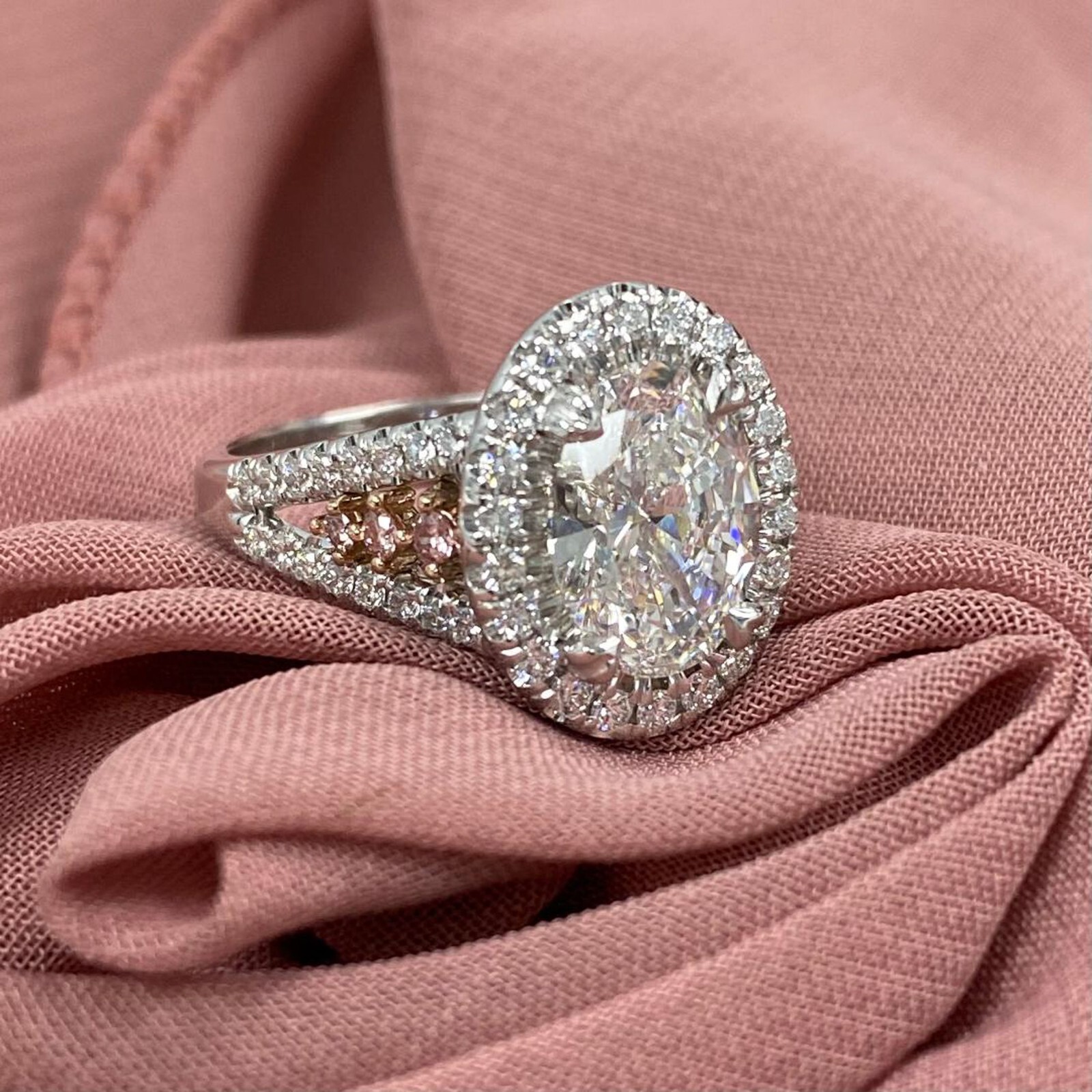 This classic and elegant lab grown diamond engagement ring is features a IGI certified (# LG6254274431) 2.25 carat D color VVS2 clarity center lab grown diamond. The center stone is complemented by 1.01 carat pink and colorless lab grown diamonds along the band and the halo. Handcrafted in 14k white gold. The total carat weight is 3.26 carats.