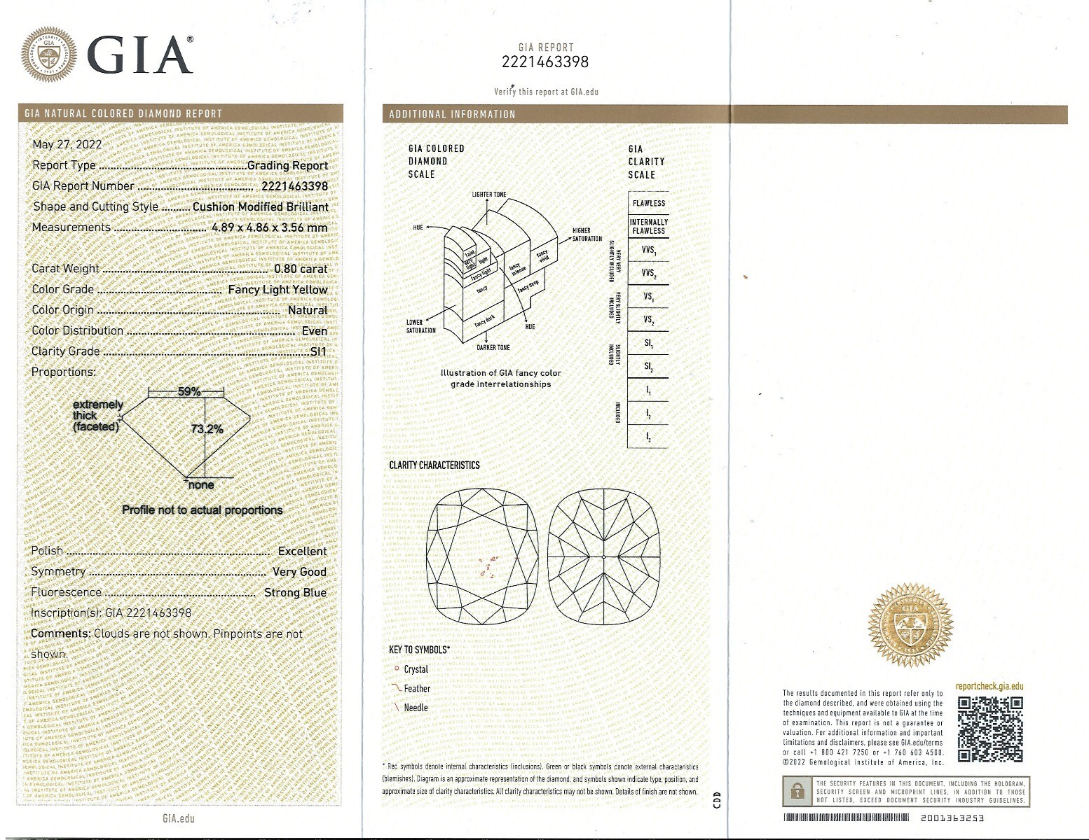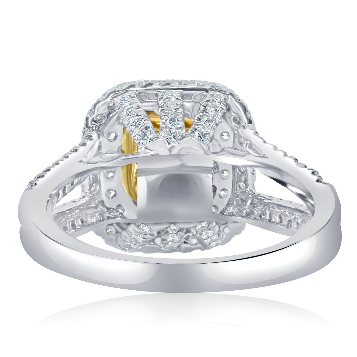 This classic diamond engagement ring is detailed to perfection, it features a GIA certified 0.80 carat natural fancy light yellow cushion brilliant cut diamond. The center stone is complemented by a double halo of colorless round cut diamonds. A split shank design with colorless sparkling diamonds completes the glamorous look of this ring. Handcrafted in 18k two tone gold. The total carat weight is 1.62 carats.