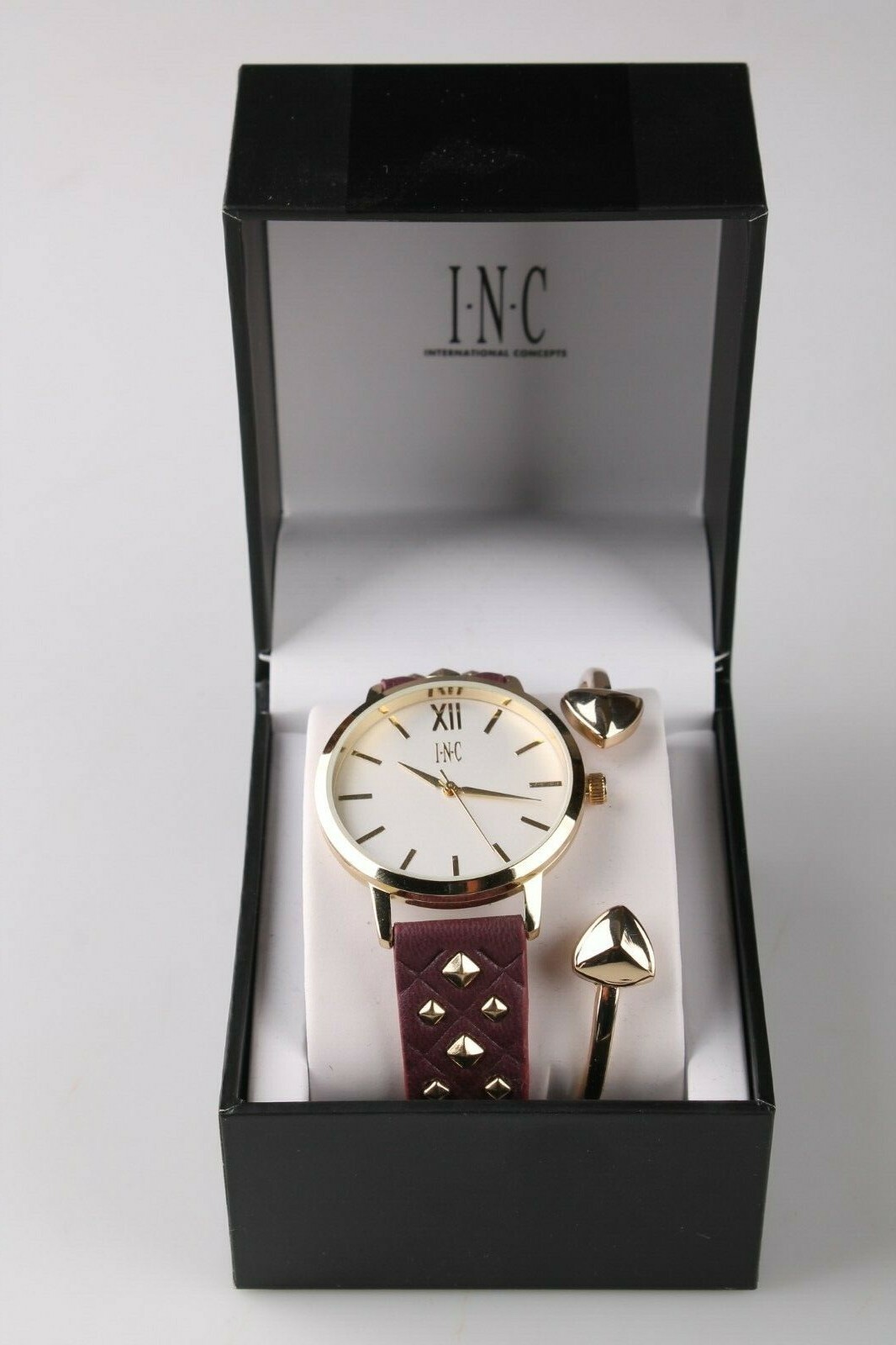 Esto es para un nuevo con etiquetas Inc con correa de cuero de falso en relieve de tono dorado de mujeres con pernos piramides de 38 mm reloj + brazalete en negro caja de regalo
