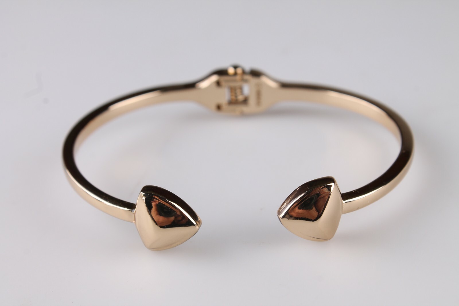 Los pernos en forma de piramide se organizan a lo largo de la correa en relieve de esta oferta de conceptos internacionales de Inc. El conjunto de regalos incluye un brazalete con bisagras con acentos piramidales.