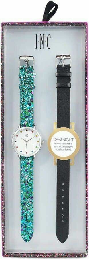 INC International Concepts abbina un quadrante cristallino multicolore spensierato con due cinturini intercambiabili in glitter o neri per questo tono piacevole.