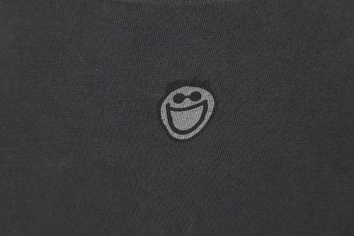 Hole left side of collar. Graphics, color faded. Dark spots/blemishes front, back. Collar, arms discolored