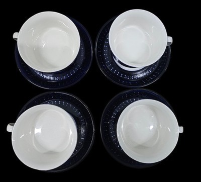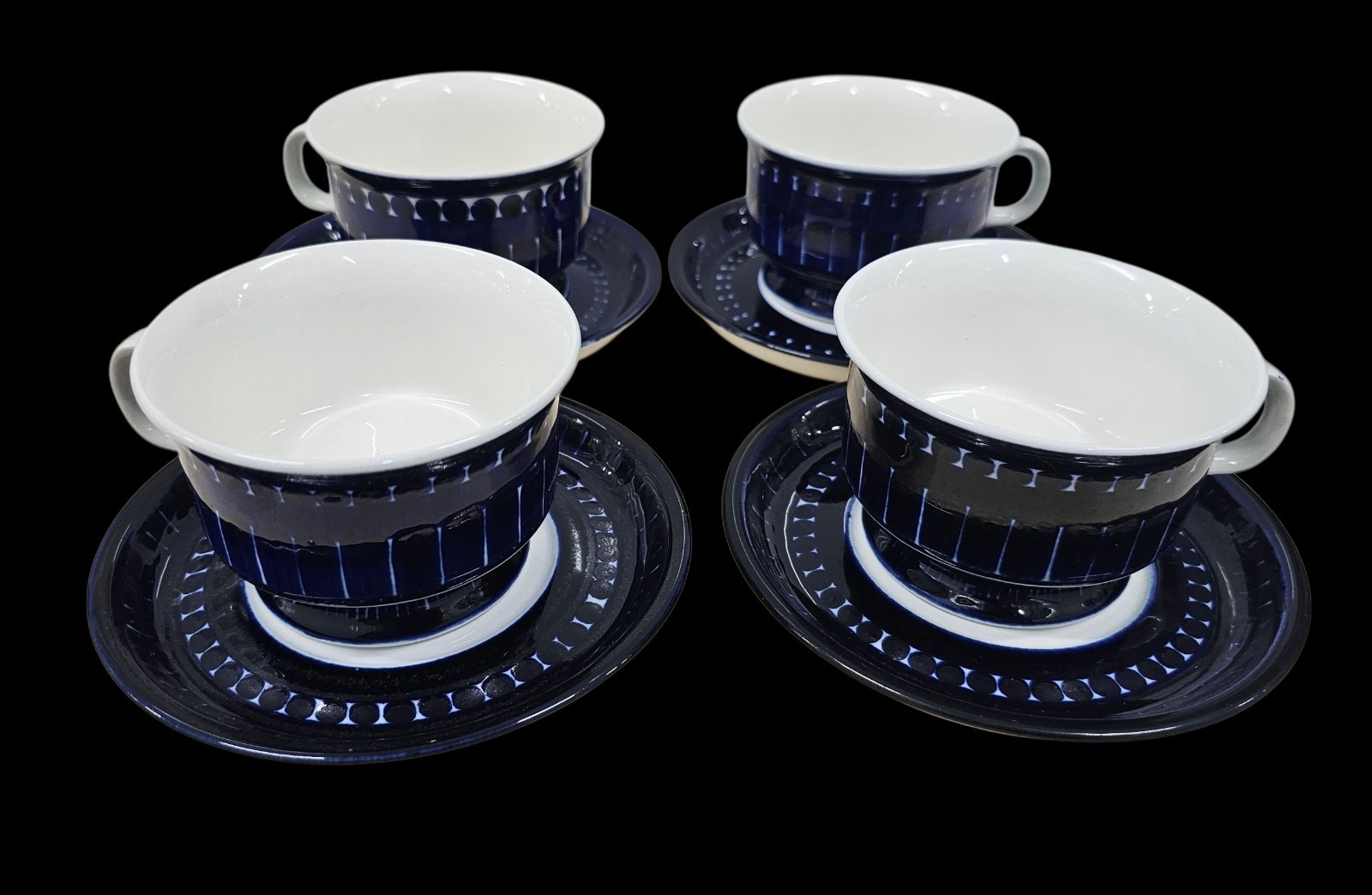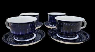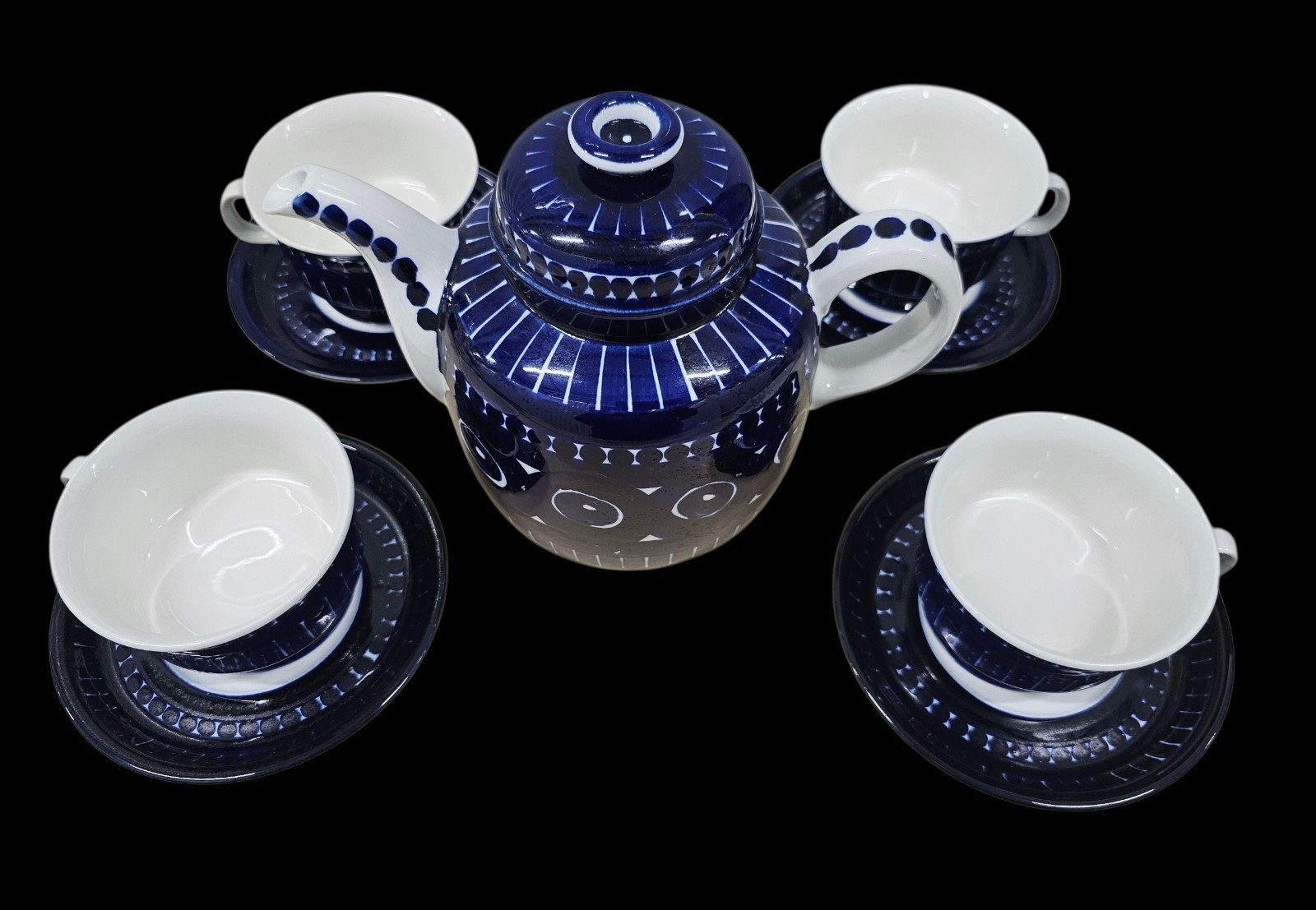 UP FOR SALE: This beautiful Arabia Finland ?Valencia? tea set which includes the teapot and four matching cups and saucers, all hand-painted in rich cobalt blue by renowned designer Ulla Procope.