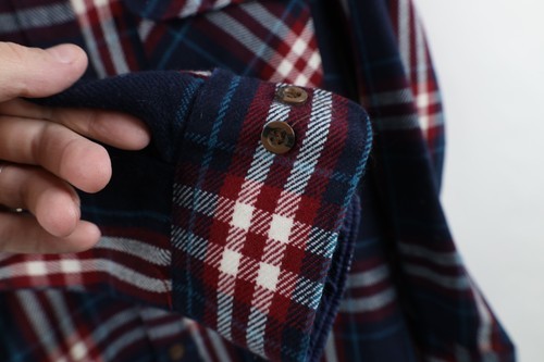 Blemishes front. Loose threads front, buttons. Collar, cuffs discolored. Color faded. Pilling