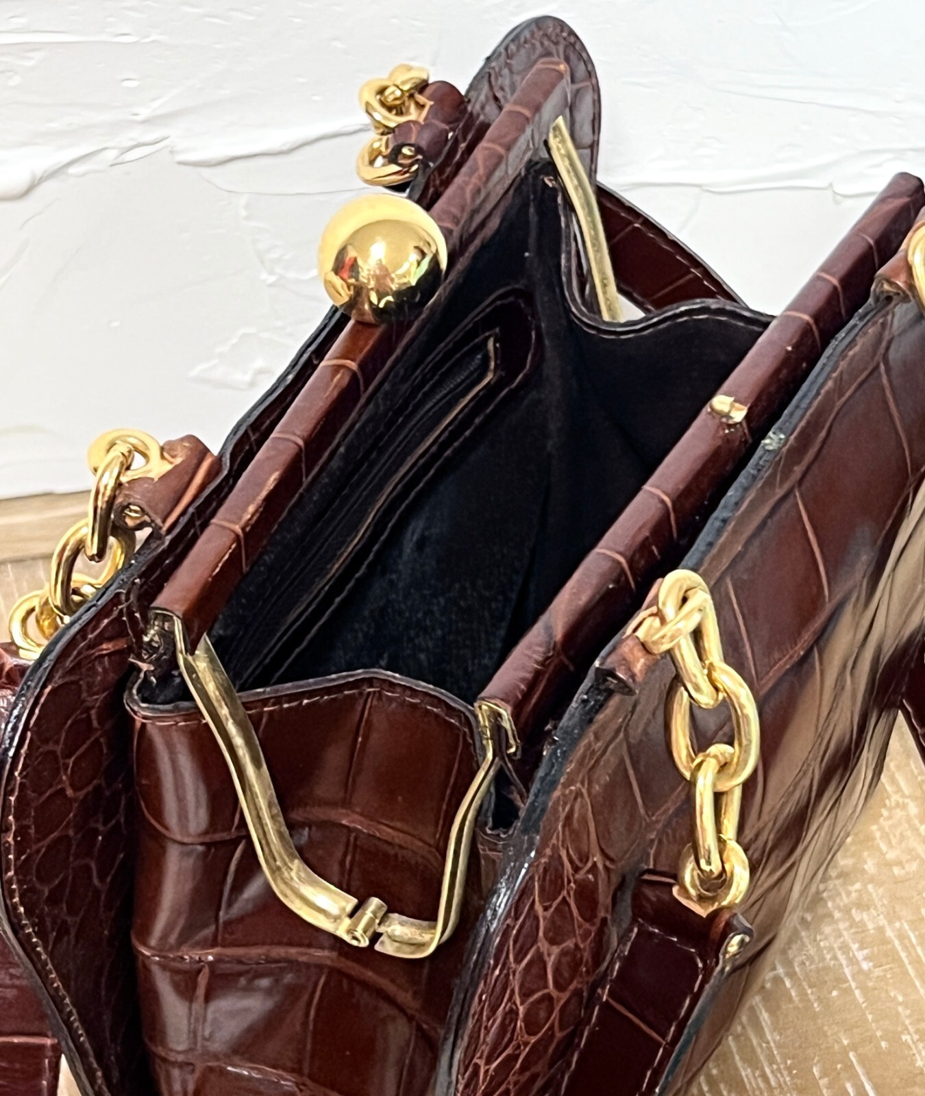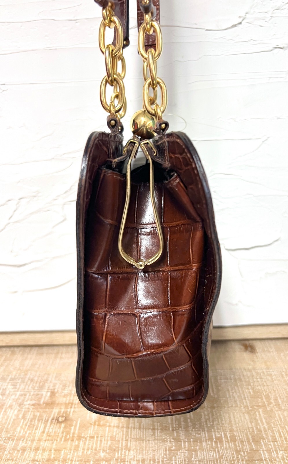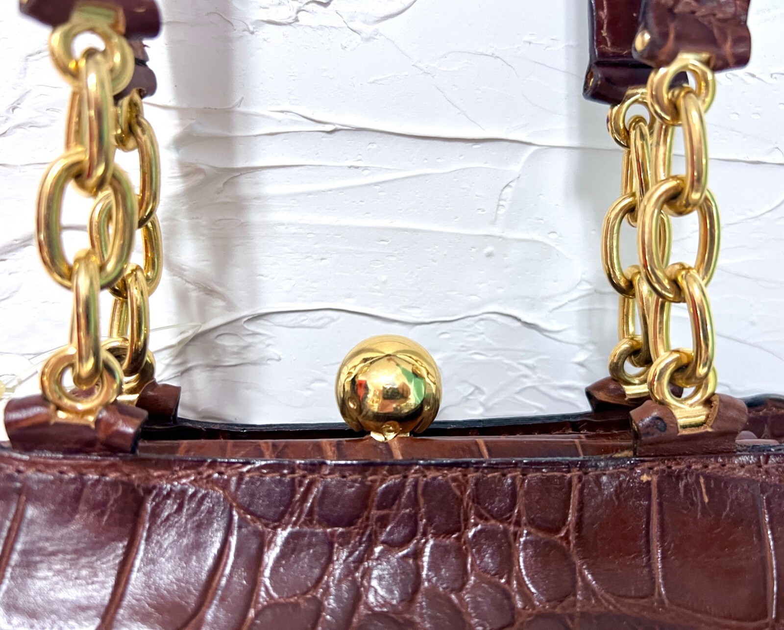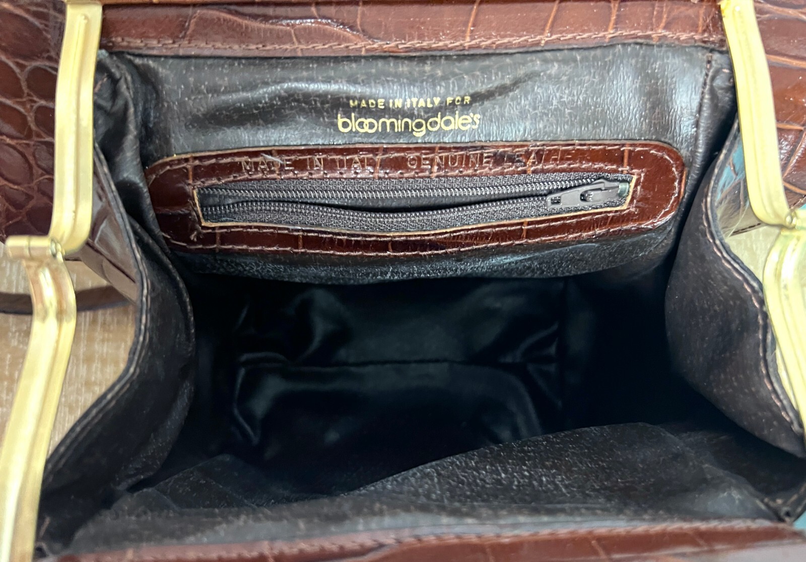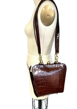 Gorgeous alligator finish leather bag has a unique shape. Made in Italy for Bloomingdales. Original tags and receipt from 1992 bloomingdales, and original box.Has feet on the. bottom and the double straps have an 18" drop. Top Quality.It was $175 in 1992- a LOT!!!