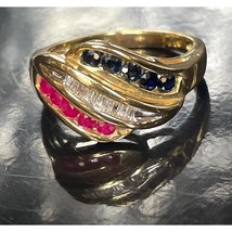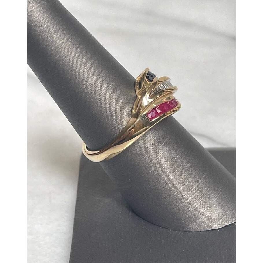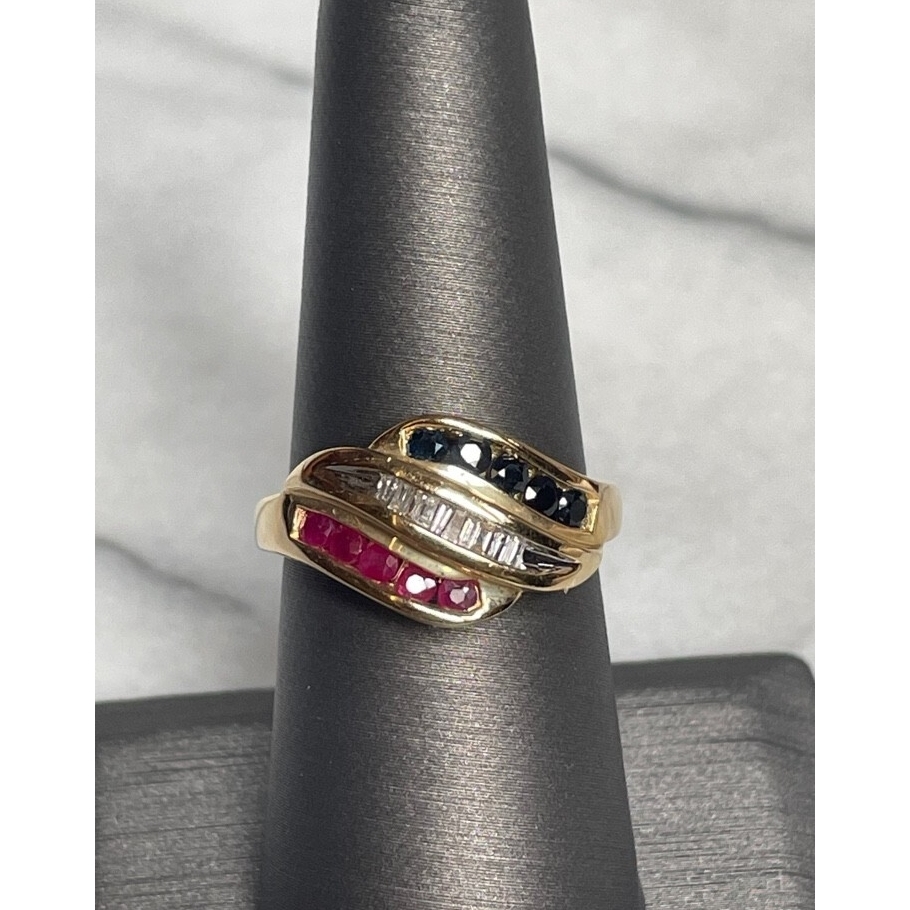 14K YELLOW GOLD DIAMOND, RUBY AND SAPPHIRE RING SIZE 7 SKY