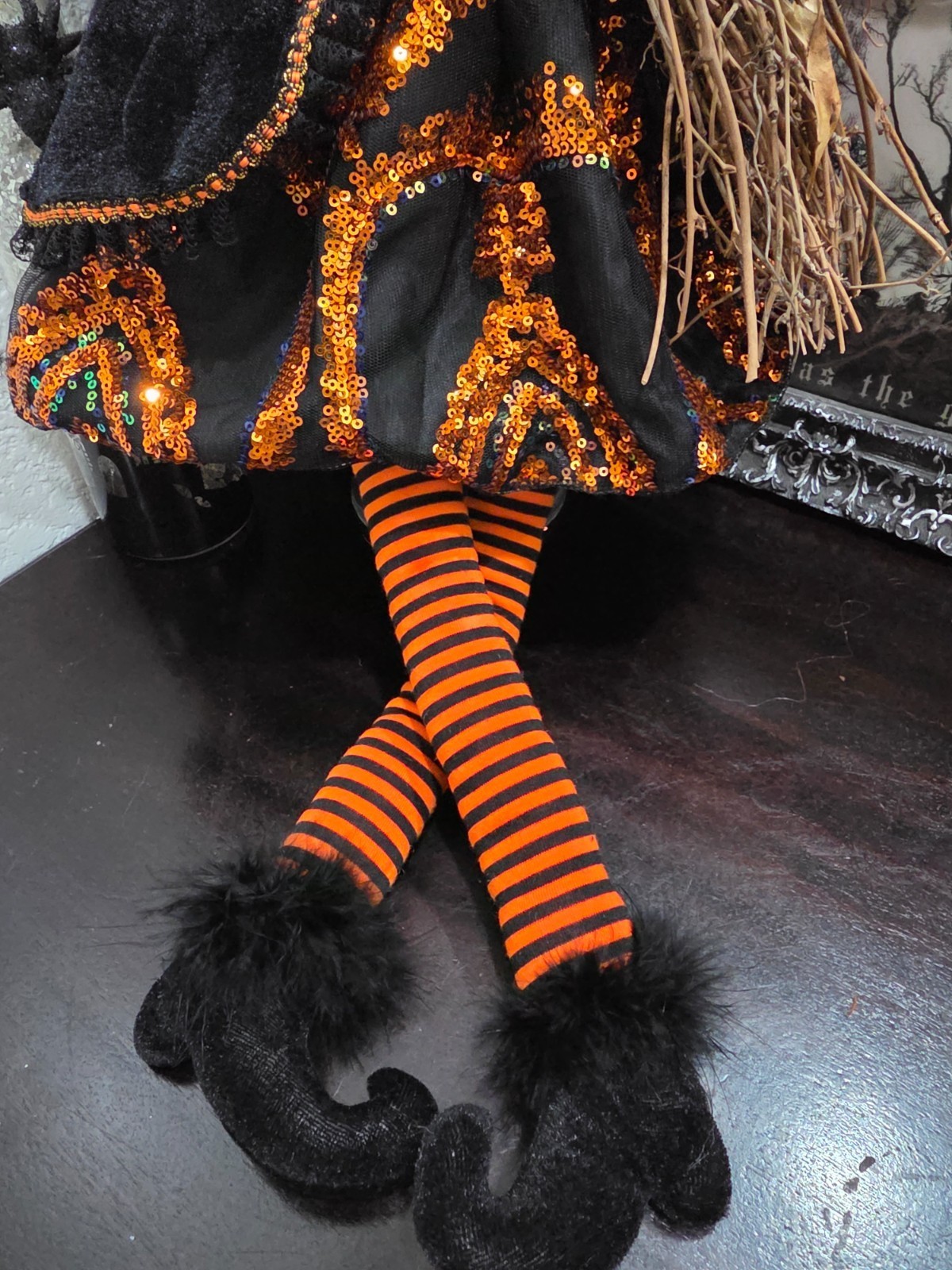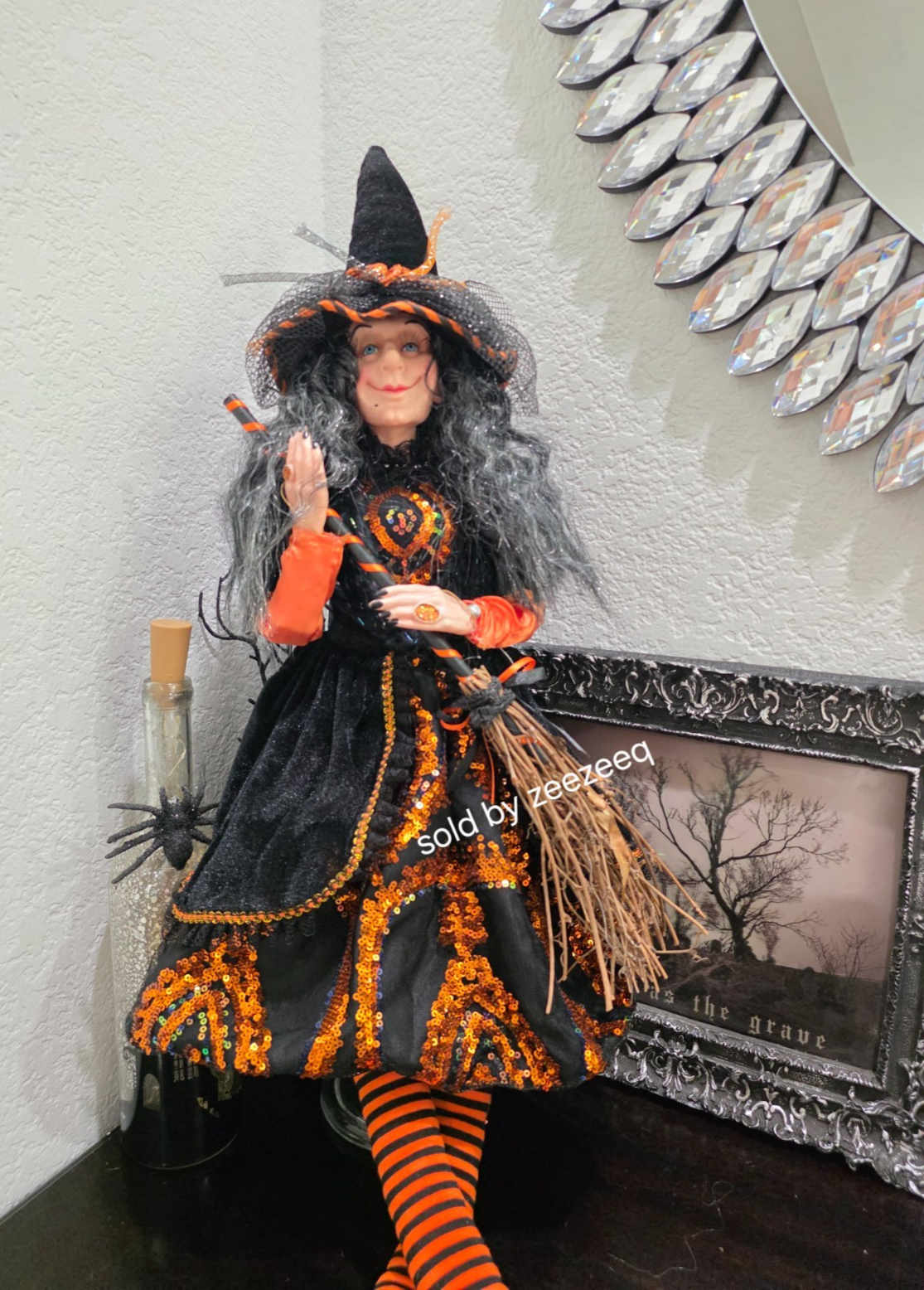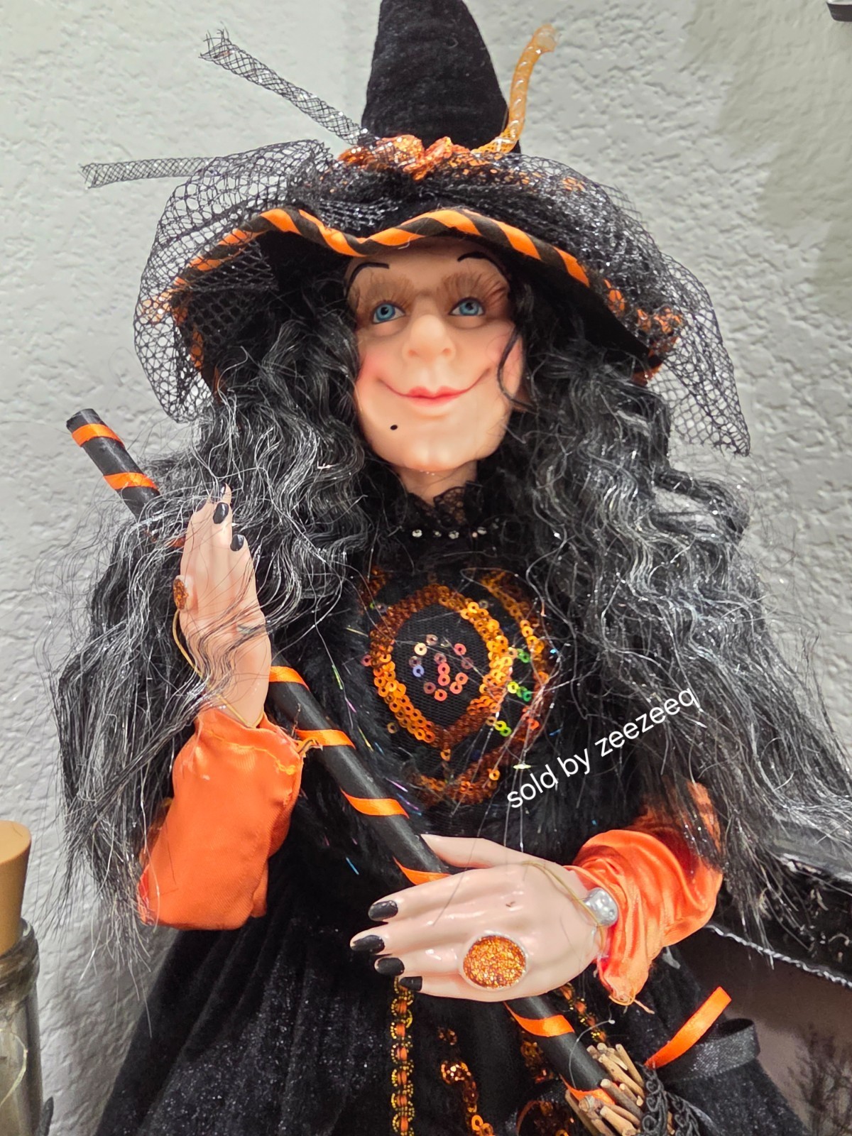 Halloween Orange Sequins Witch Holding Broom Shelf Sitter Doll Figure 31" NEW