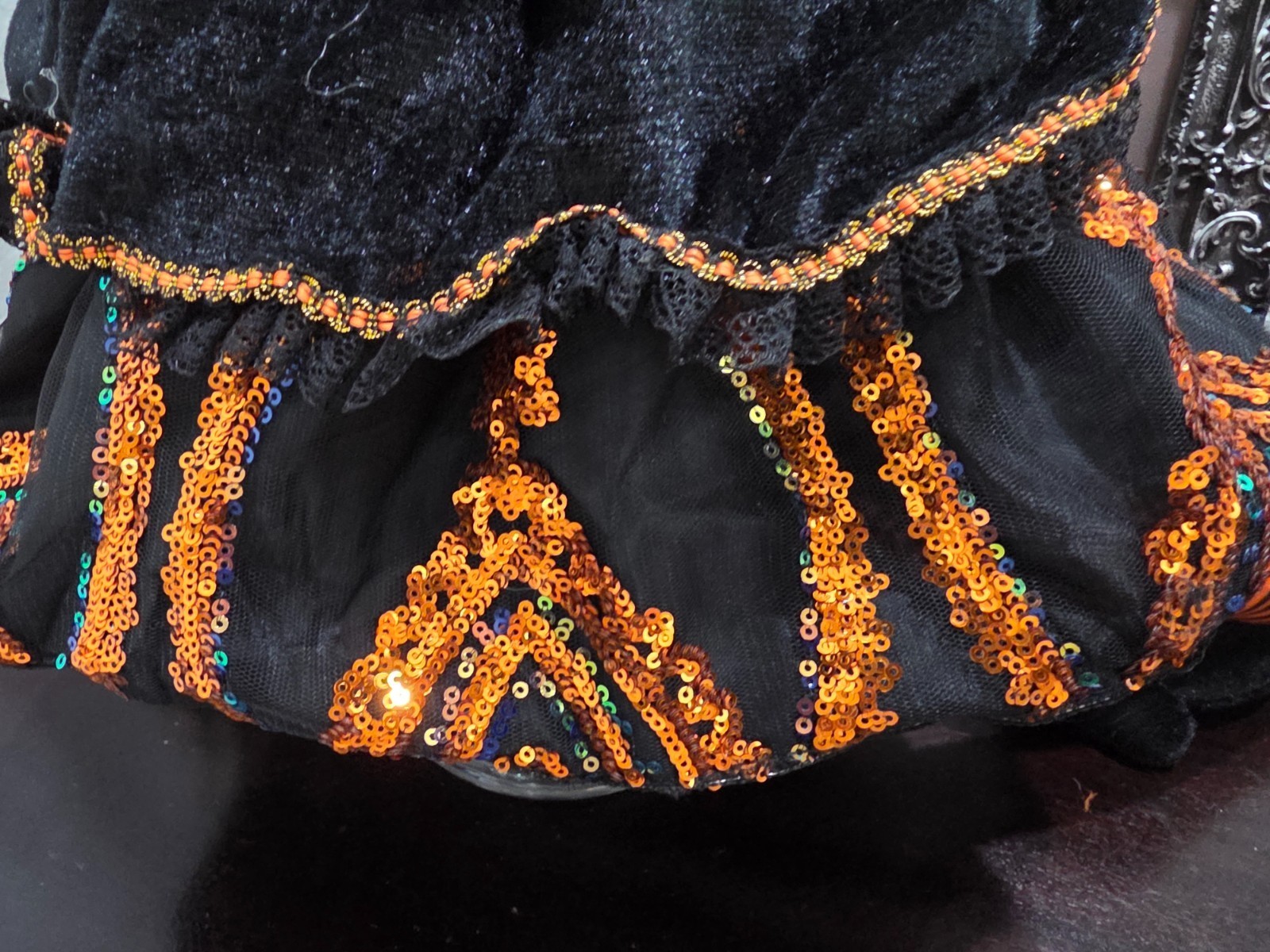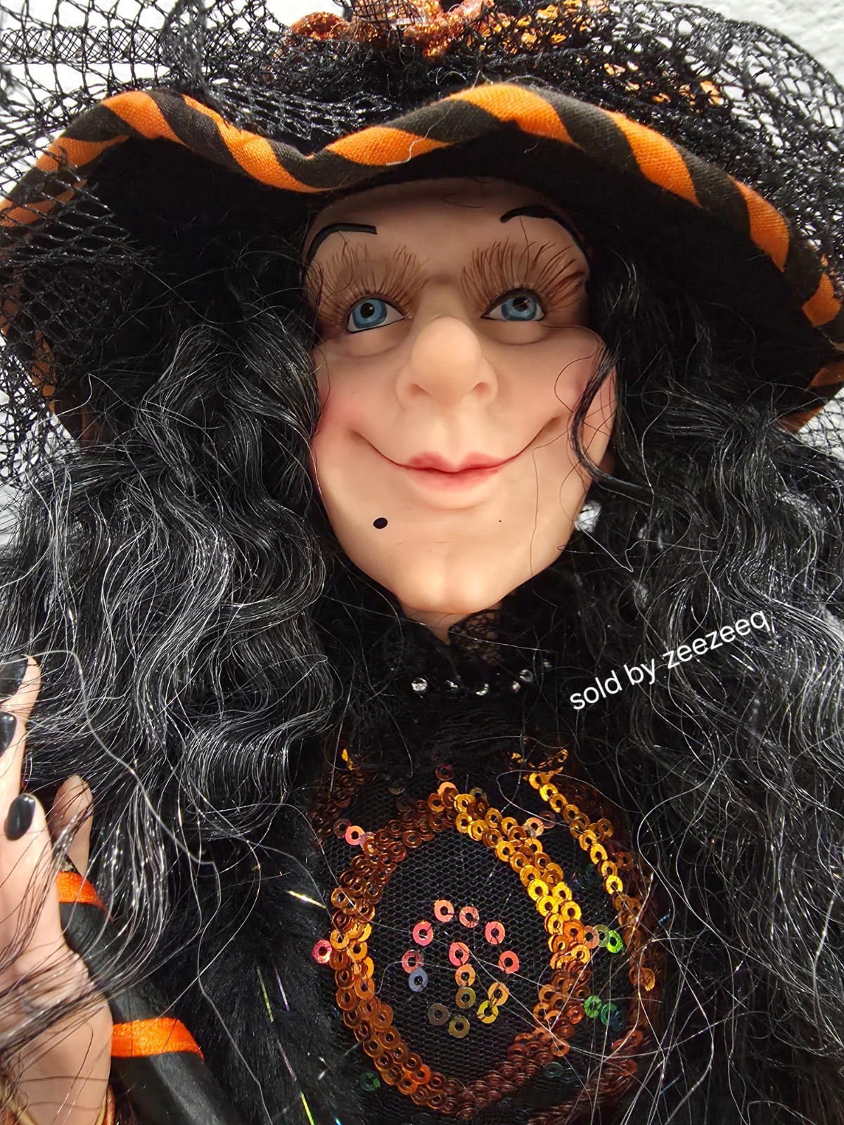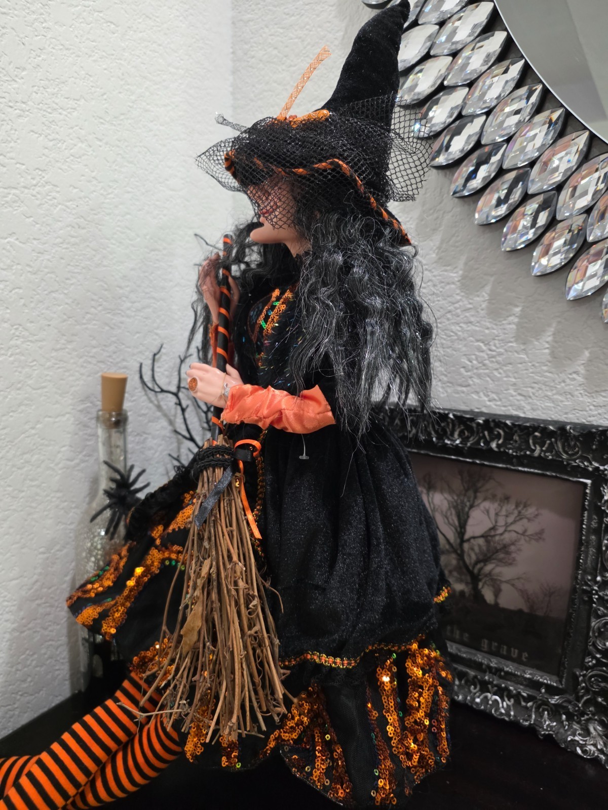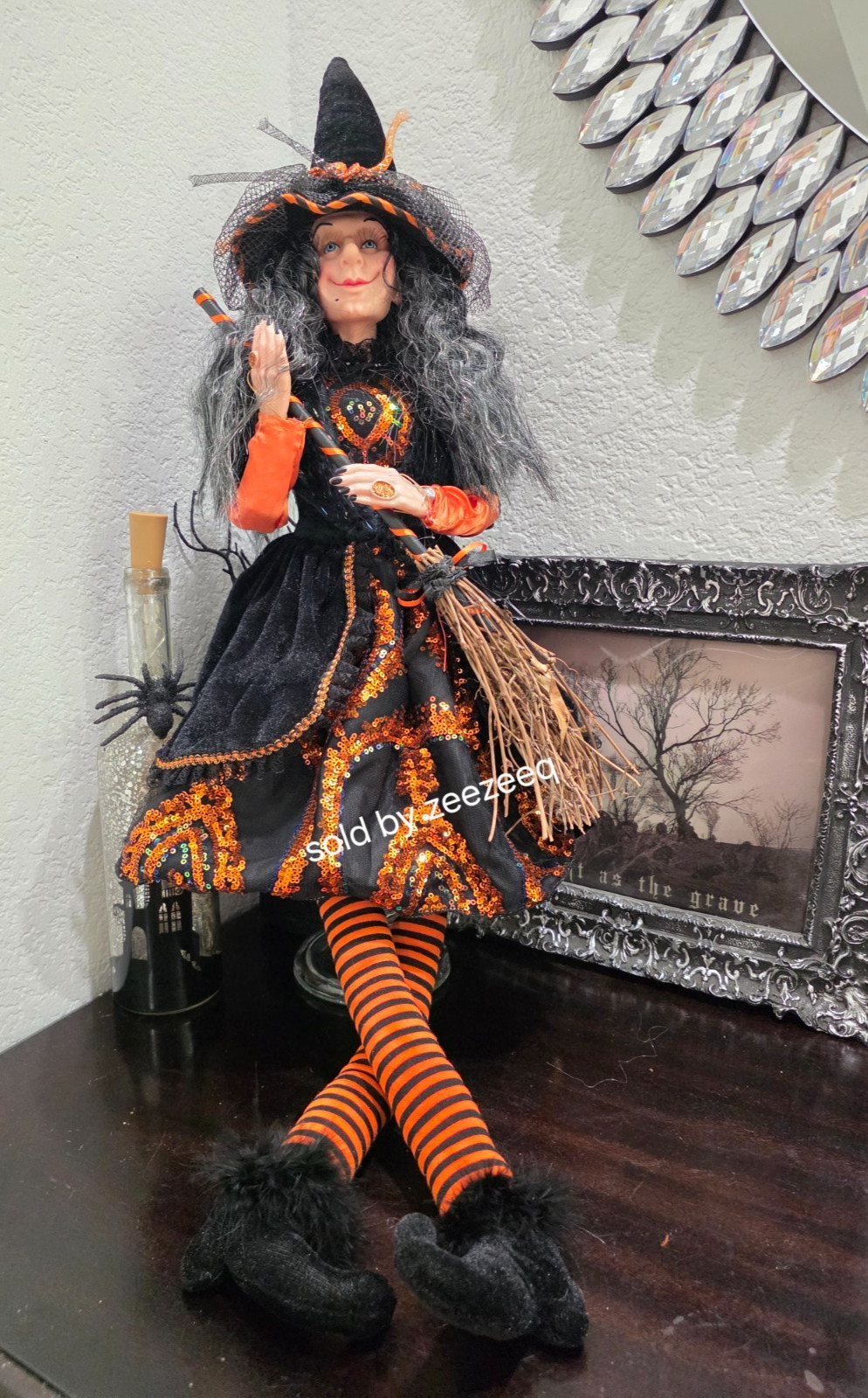 Halloween Orange Sequins Witch Holding Broom Shelf Sitter Doll Figure 31" NEW