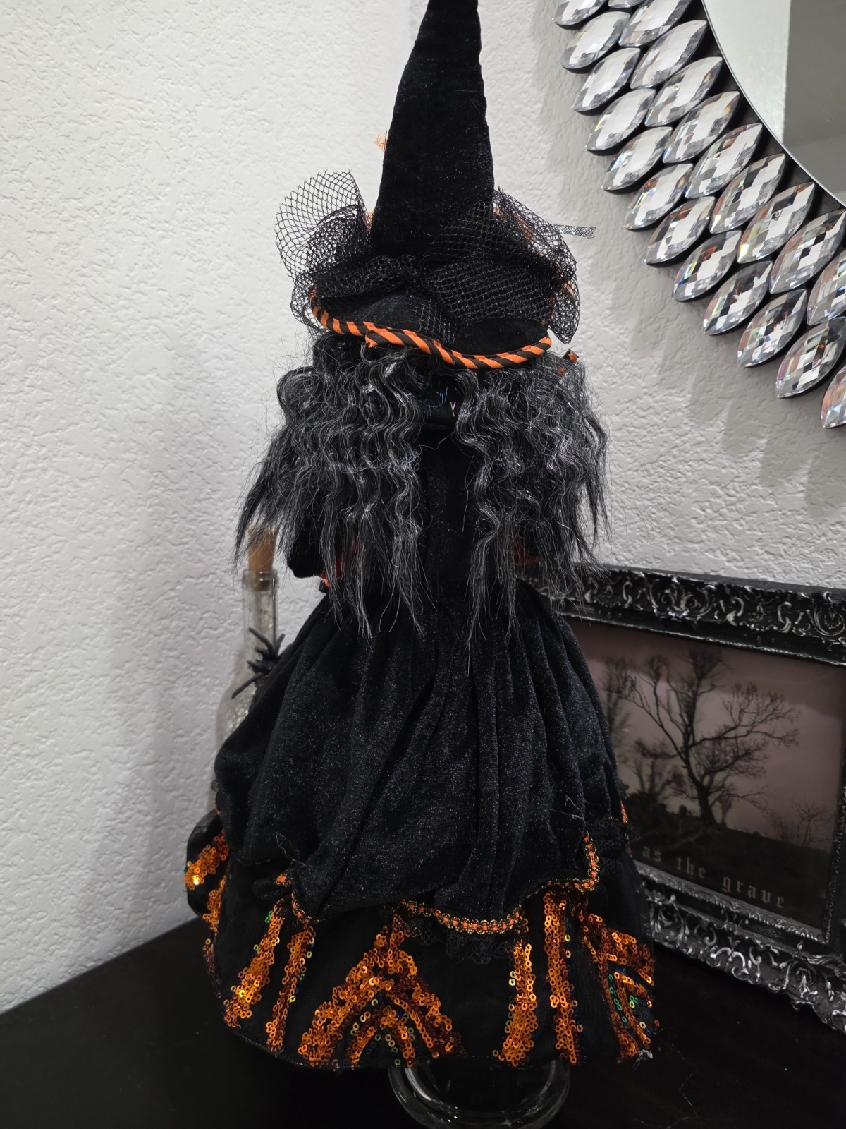 Up for sale we have this beautiful witch for your Halloween tabletop decor. She will look amazing with your decor. She is wearing a black dress with orange sequins. Sitting up she measures approx 19" and laying flat she measures approx 31" long. She's adorable!. NEW