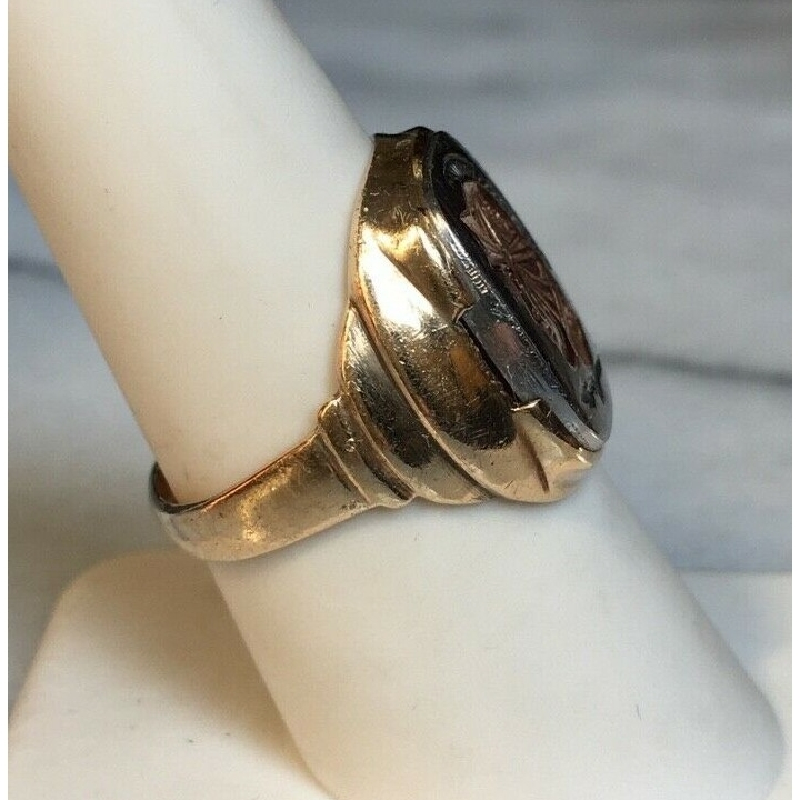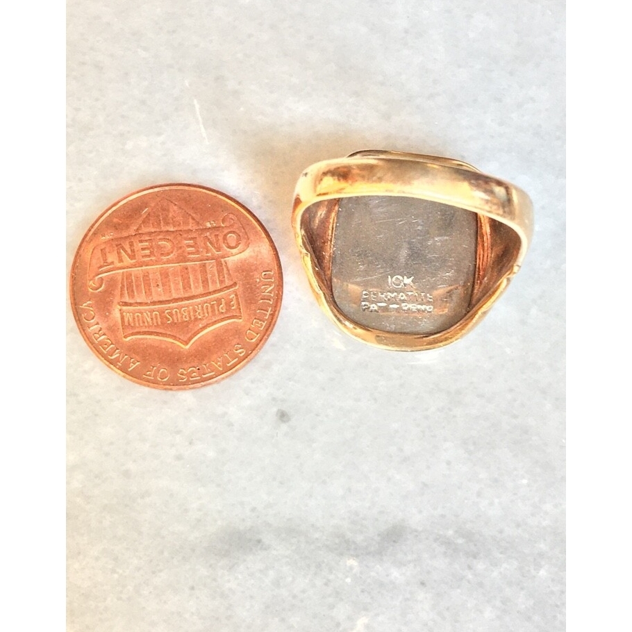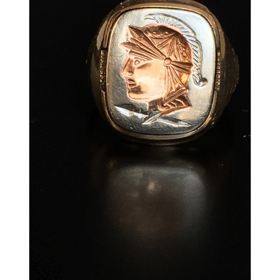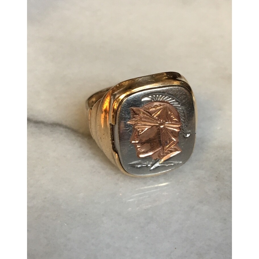 ART DECO YELLOW GOLD PERMATITE WARRIOR INTAGLIO SIGNET RING. SIZE 7.75 SKY