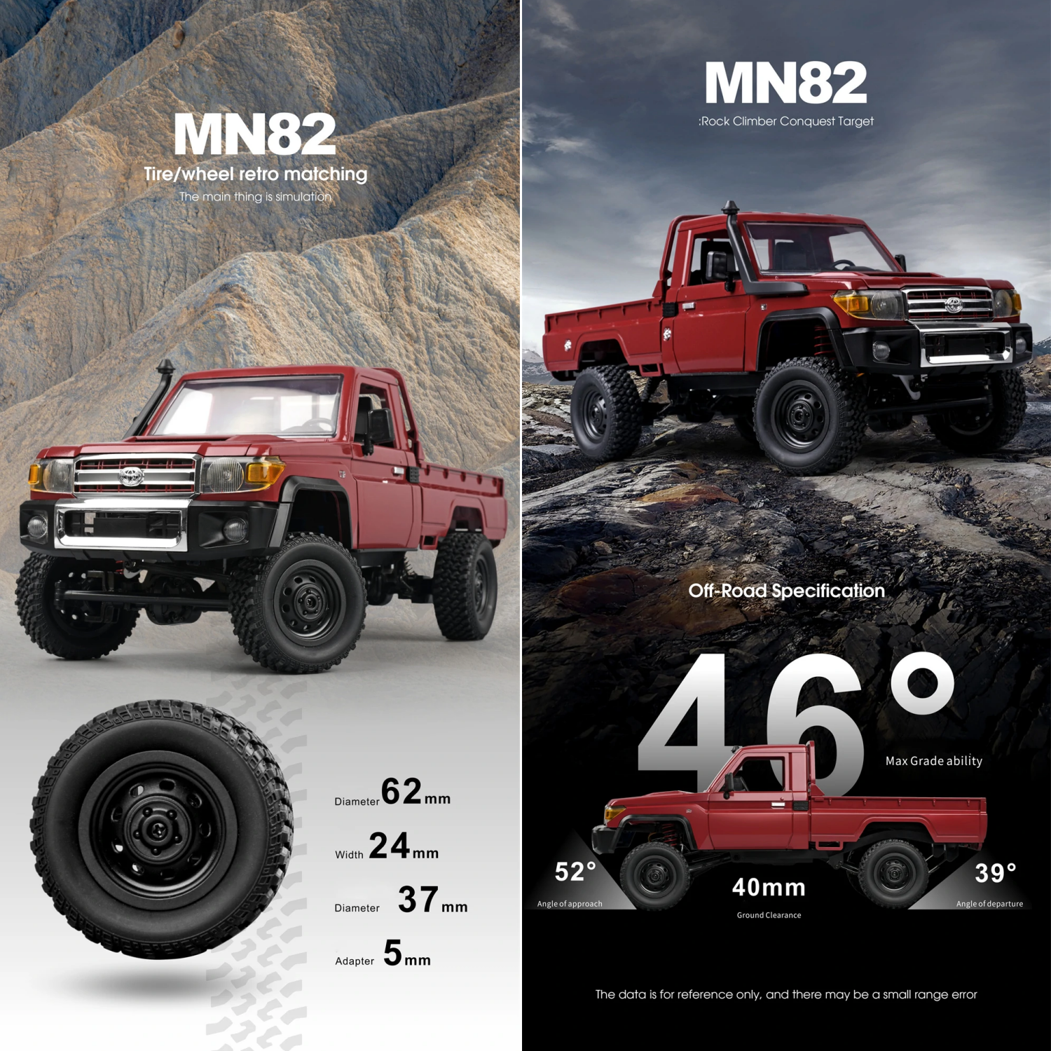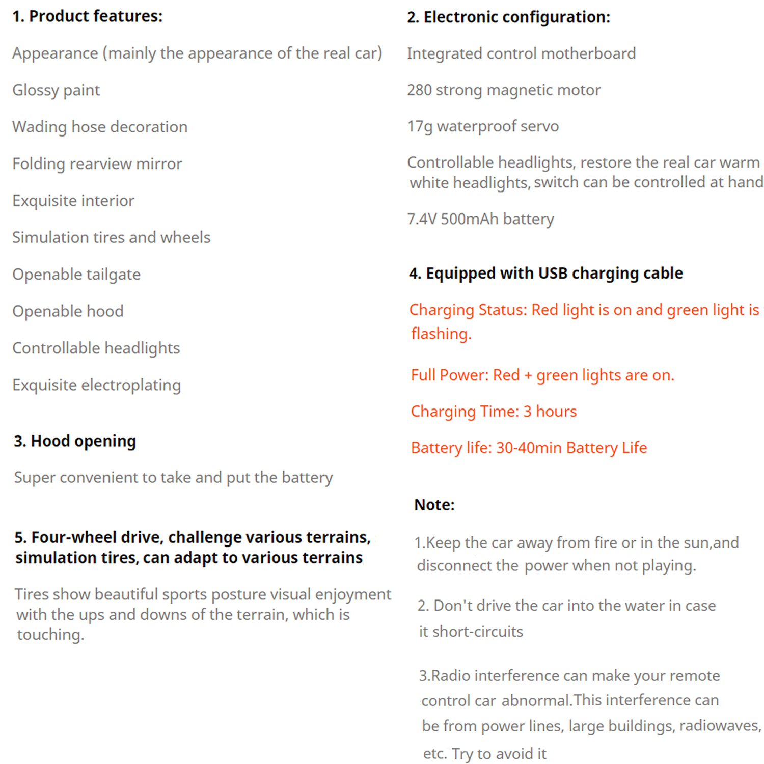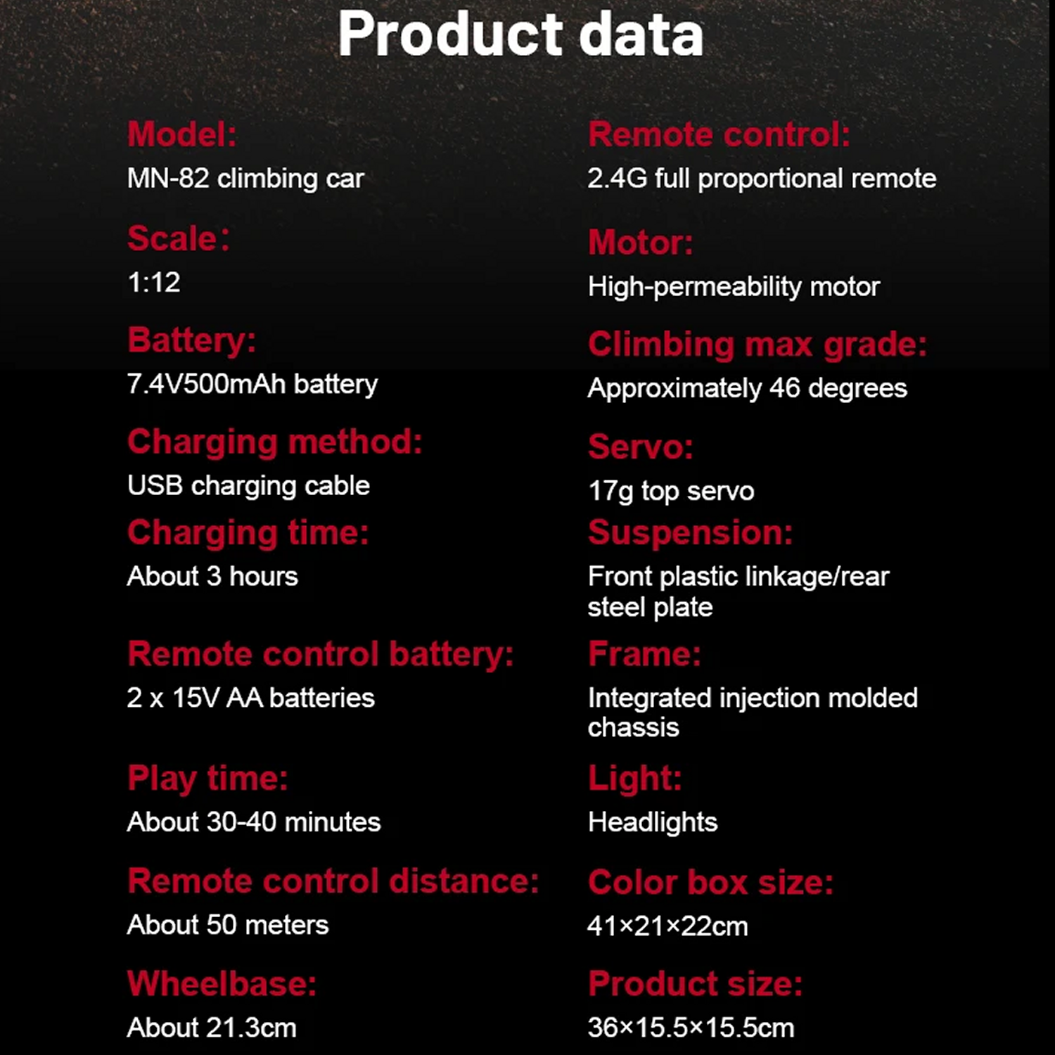 Max Climbing Angle: 46°; 2.4G remote controller; Headlights |