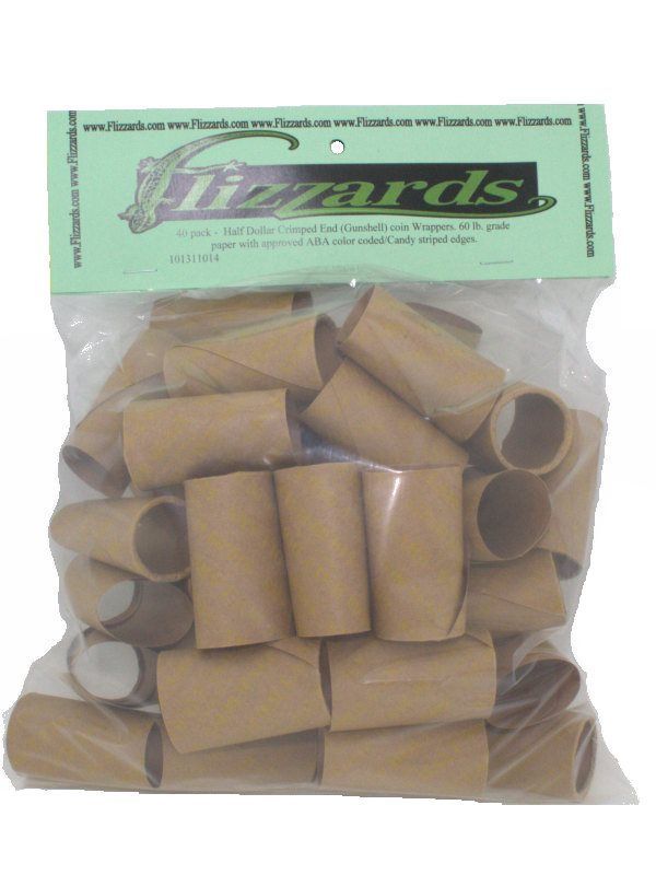 Half Dollar Crimped end preformed coin wrappers. THIS IS OUR MOST POPULAR ITEM! The crimp at one end keeps them open and ready to fill, by hand or machine. We have improved our machines so they provide an extra tight crimp that withstands rough handling yet provides an inside diameter guaranteed to hold the proper coin. Kraft finish with approved ABA color coded, candy striped edges and denominations.