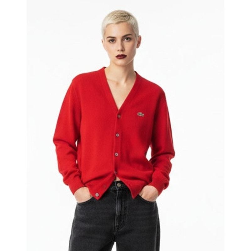 What you?ll love about this piece is its timeless preppy elegance ? a cherry red Orlon acrylic cardigan from the 1970s with the iconic Lacoste crocodile logo. Lightweight yet cozy, with that soft vintage drape and clean button-down front that embodies classic collegiate style.