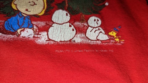 This Vintage Peanuts Charlie Brown T-Shirt is a festive addition to any Christmas or holiday wardrobe. There is a small hole under left armpit. Made from comfortable cotton material with a red color and featuring a classic graphic print of Charlie Brown and the Peanuts logo, this short sleeve shirt is machine washable and suitable for all seasons. The crew neckline and regular fit make it easy to wear, and the vintage design adds a nostalgic touch to the overall look. Perfect for fans of the Peanuts franchise, this lightweight shirt is a must-have for any classic holiday style lover.