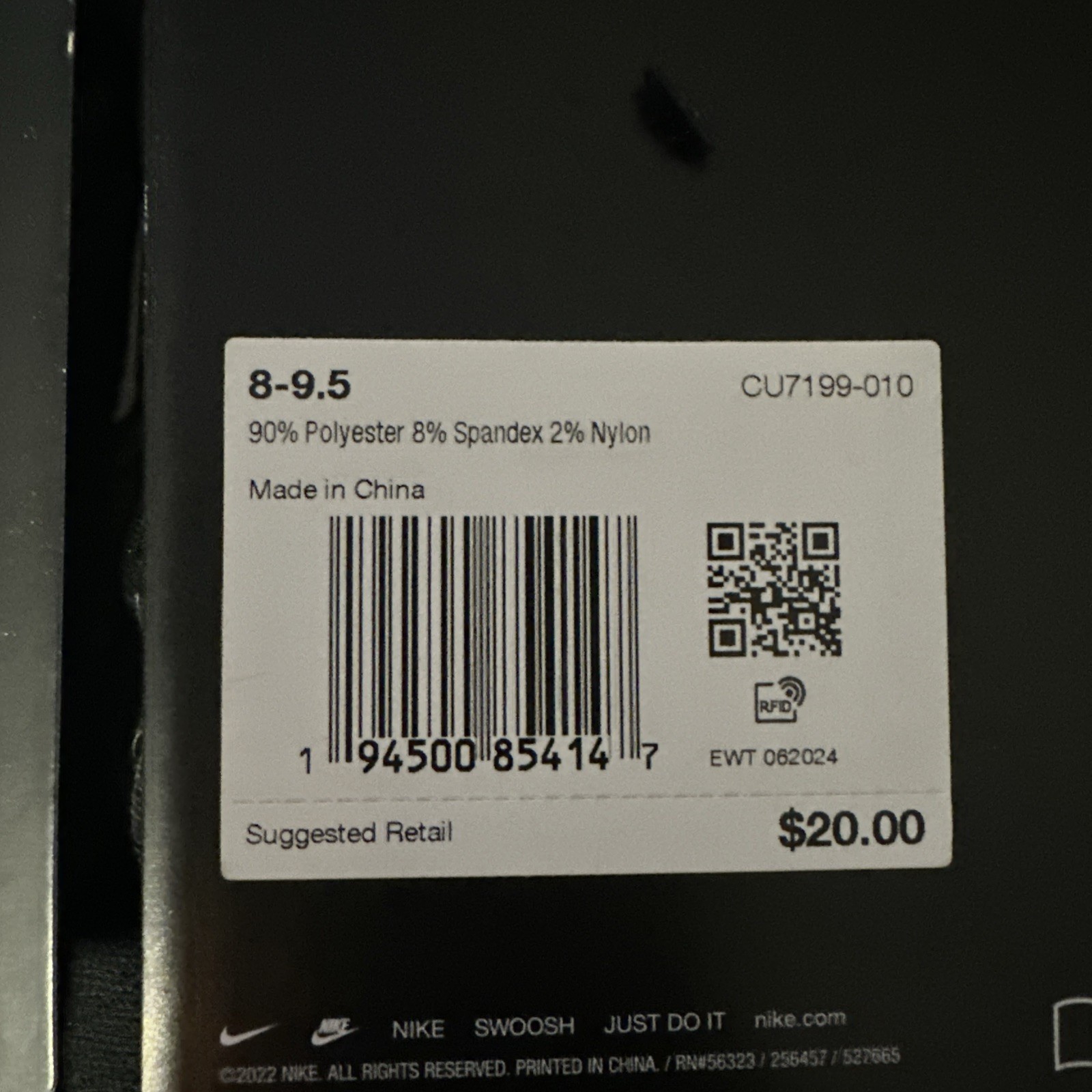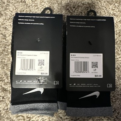 The product is a pair of two Nike Dri-FIT Spark Cushioned Ankle Running Socks in size M 8-9.5 and W 9.5-11, designed in a solid black color. Made of polyester, nylon, and spandex, these athletic socks are perfect for running and jogging, providing comfort and support. With cushioning for added comfort, these ankle socks are ideal for both men and women looking for high-performance socks to enhance their workout experience. Made by the renowned brand Nike, these socks are a reliable and stylish choice for any fitness enthusiast.