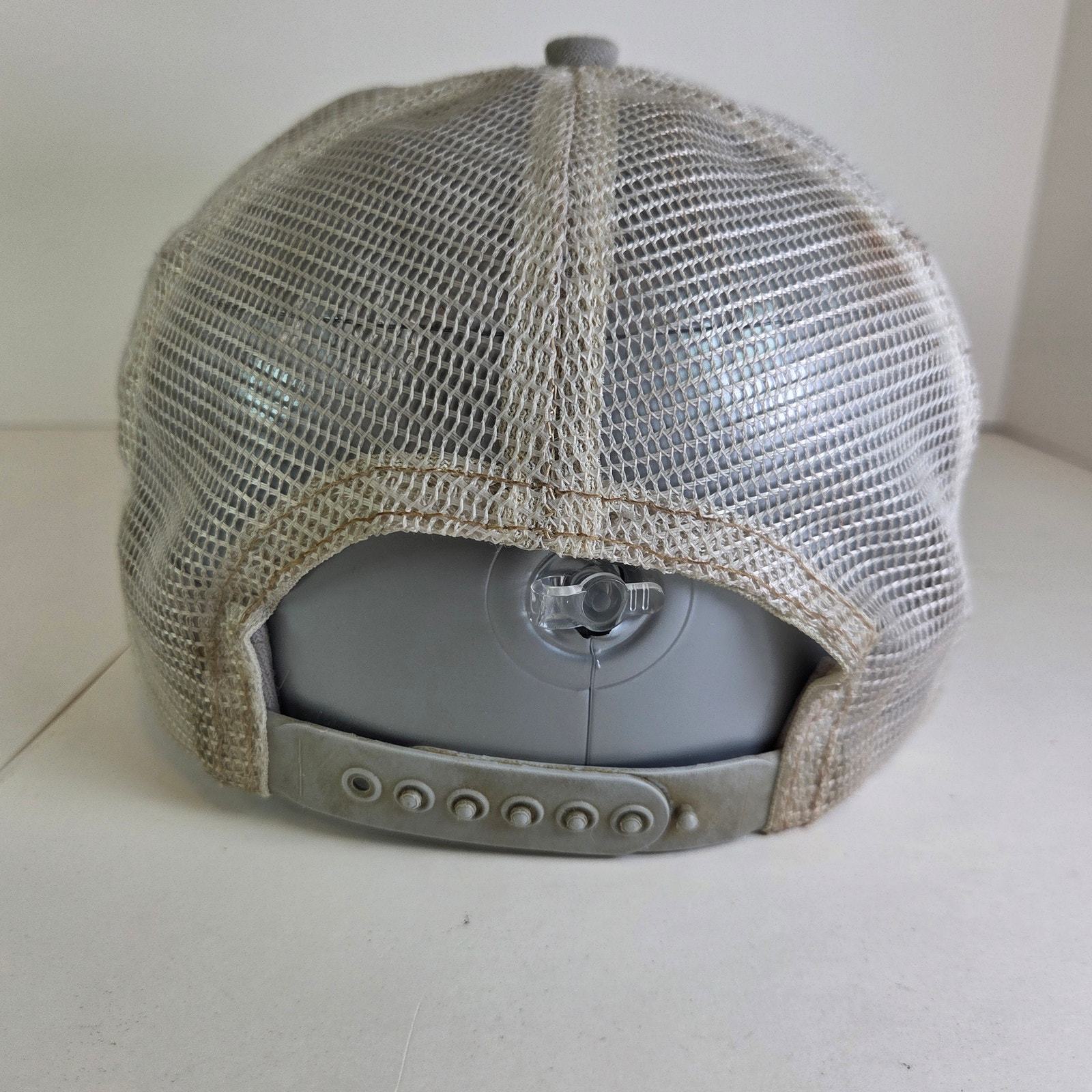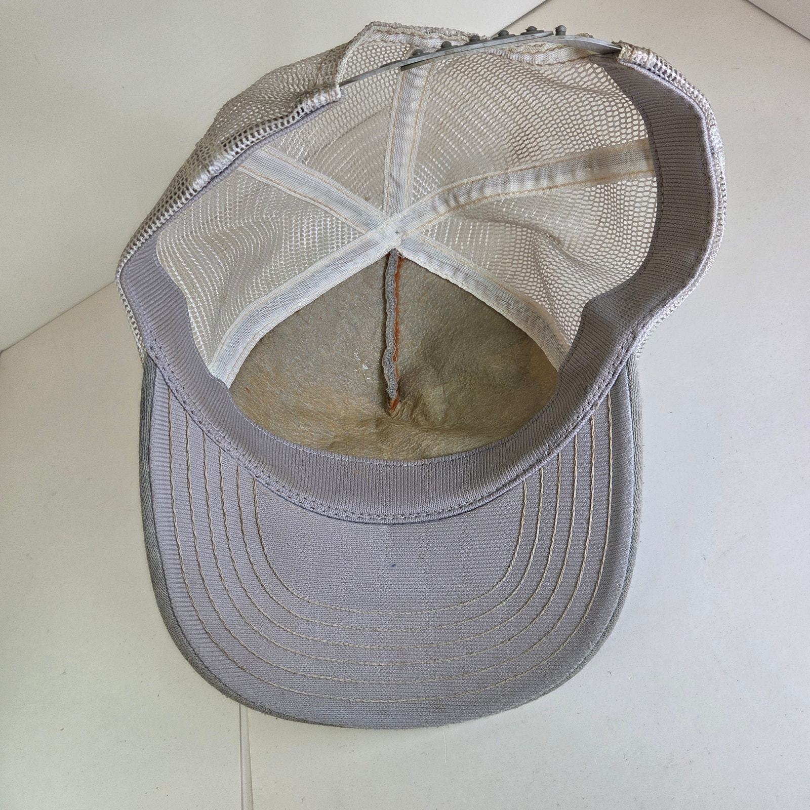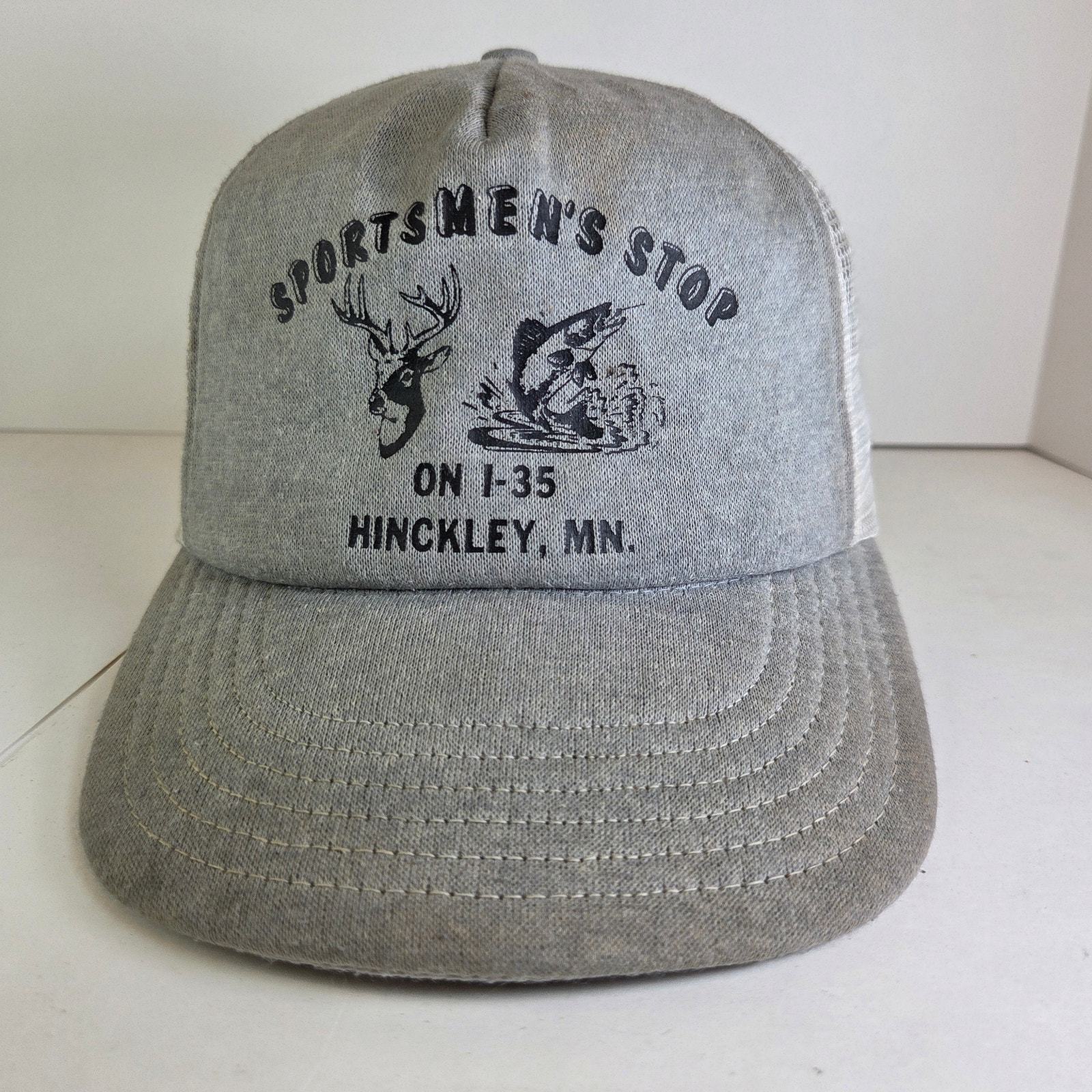 This is a vintage trucker snapback hat from Sportsmen?s Stop on I-35 in Hinckley, Minnesota. Features hunting and fishing graphics with a deer and fish illustration. The hat has a foam front with mesh back. Please note the foam has completely deteriorated (foam rot), causing staining and discoloration on the crown. Still a collectible regional advertising cap for display or restoration.