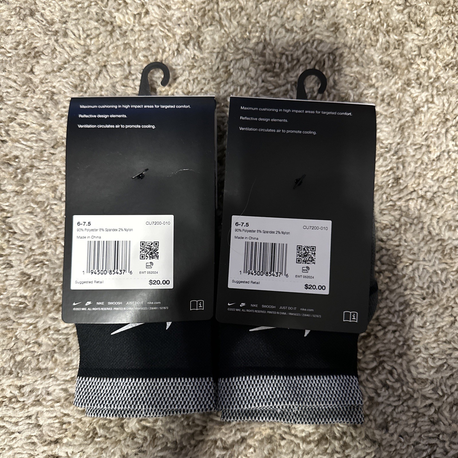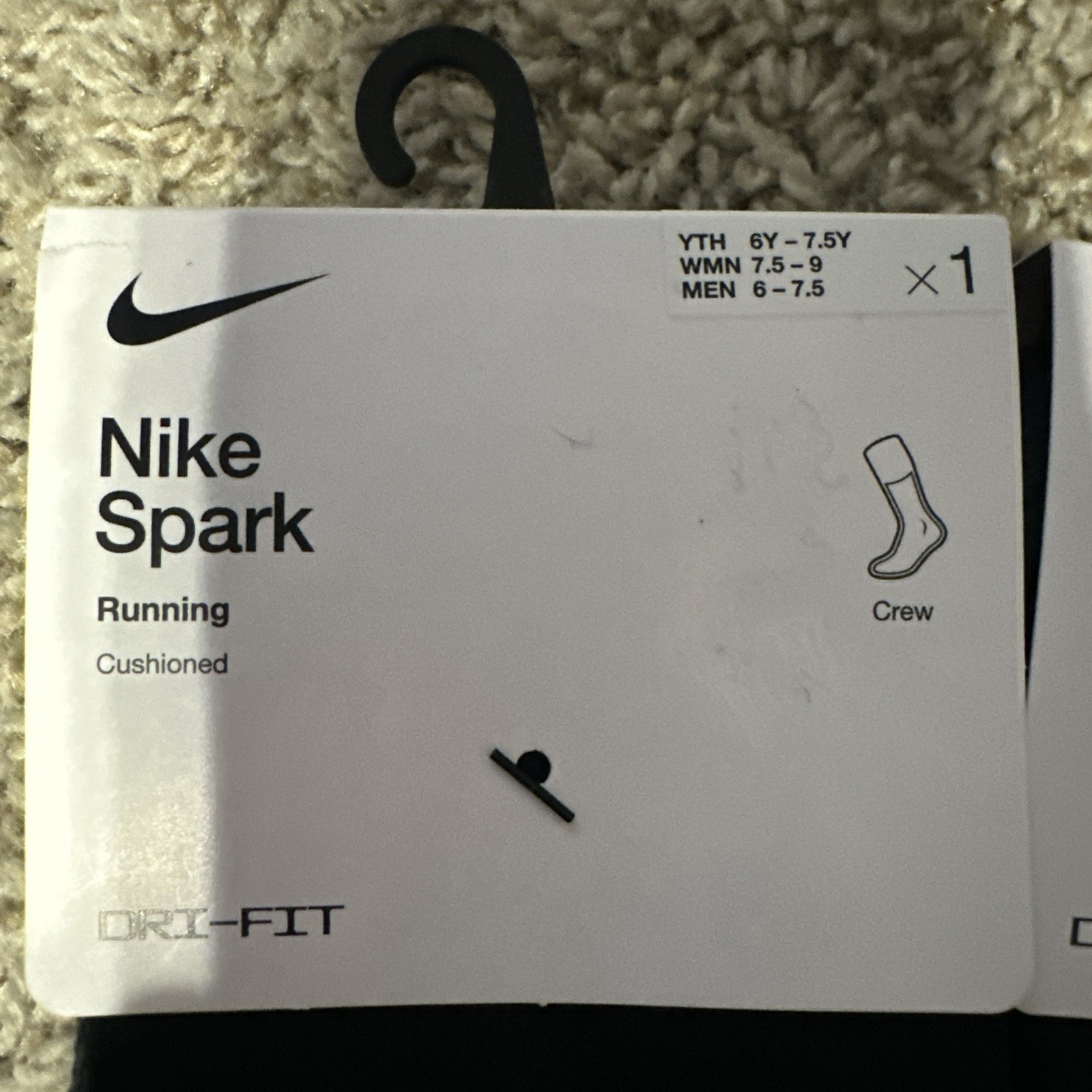 The product is a pair of Nike Spark Running Cushioned DRI-FIT athletic socks in size M6-7.5. These black socks are made of polyester, nylon, and spandex, featuring a solid pattern and mid-calf length. Designed for casual occasions, they are machine washable and have a cushioned design for added comfort during various activities such as running, jogging, cycling, tennis, and cross-training. With a sports-themed design and Nike logo, these athletic socks are suitable for unisex adults and are ideal for wearing during gym and training sessions in the summer, fall, and spring seasons.