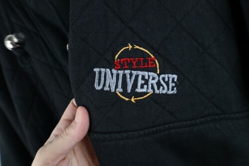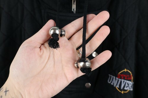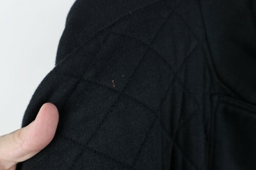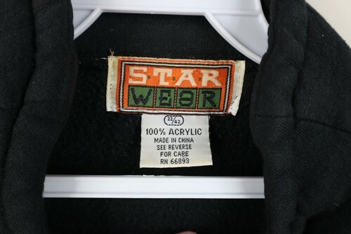 Strings distressed, plastic pieces tarnished. Bleach stains right shoulder. Blemishes front, back, bottom string. Collar, cuffs discolored. Design distressed. Color faded. Pilling. Loose threads front