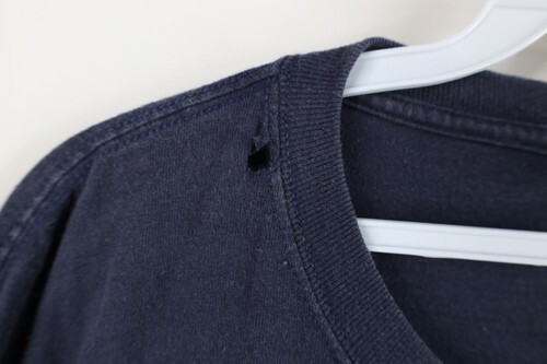 Hole right shoulder. Blemishes/discoloring throughout. Blemishes collar. Collar, cuffs discolored. Graphics, color faded. Pilling