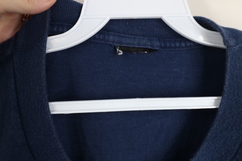 Hole front bottom. Blemishes shoulders, inner collar, back top. Collar, arms discolored. Graphics, color faded. Pilling