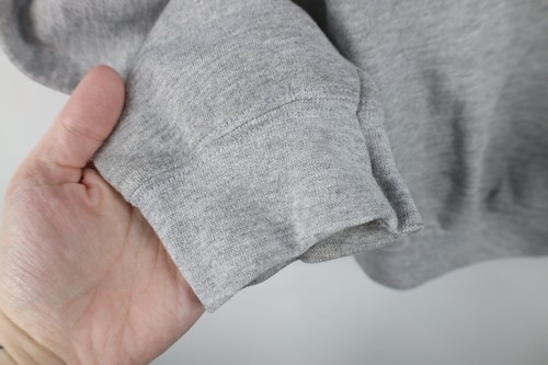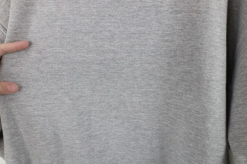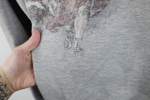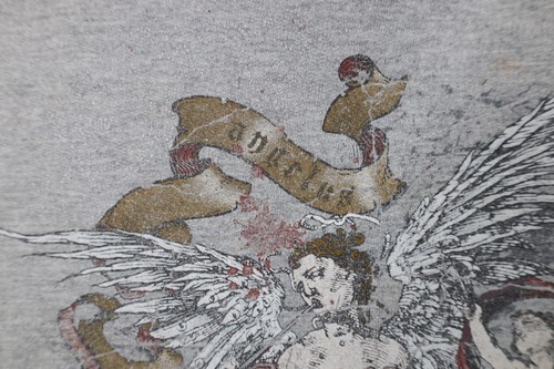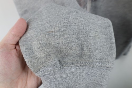 Stains arms. Dark spots throughout. Collar, cuffs discolored. Graphics, color faded. Pilling