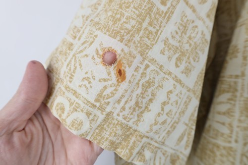Collar, armpits discolored. Color faded. Pilling. Hole right sleeve/stains